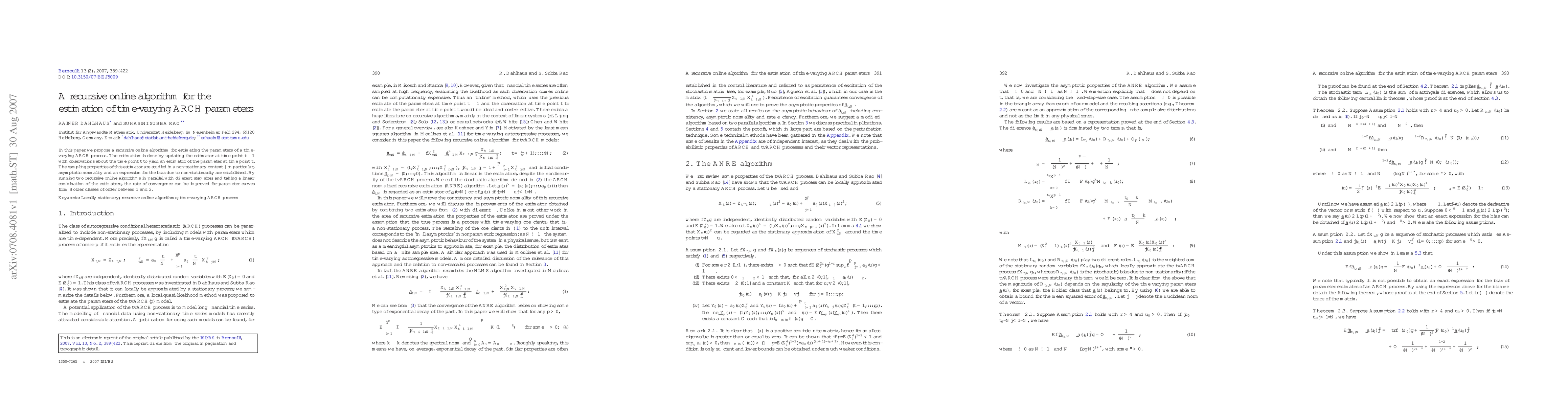 This paper proposes a recursive online algorithm for estimating time-varying ARCH parameters, updating the estimator with new observations to improve convergence rates. The study establishes asymptotic normality and bias due to non-stationarity, and enhances convergence by running parallel algorithms with different step sizes.