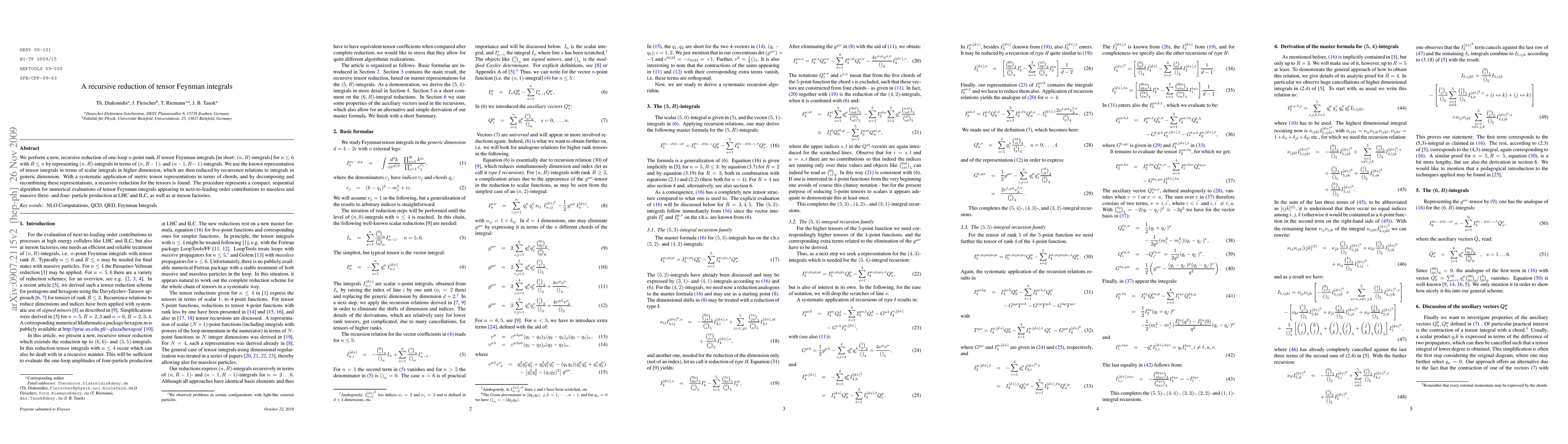This paper presents a recursive algorithm for reducing tensor Feynman integrals of one-loop $n$-point rank $R$ to simpler forms using a combination of scalar integrals and metric tensor representations, facilitating their numerical evaluation in high-energy physics contexts. The method is particularly useful for calculating next-to-leading order contributions in particle production processes.