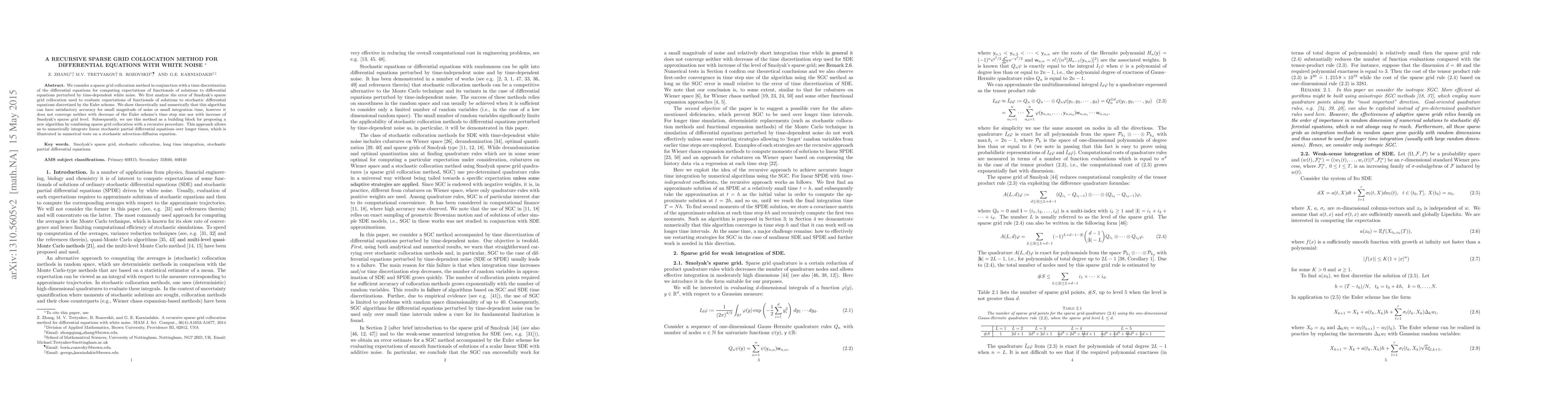 We consider a sparse grid collocation method in conjunction with a time discretization of the differential equations for computing expectations of functionals of solutions to differential equations perturbed by time-dependent white noise. We first analyze the error of Smolyak's sparse grid collocation used to evaluate expectations of functionals of solutions to stochastic differential equations discretized by the Euler scheme. We show theoretically and numerically that this algorithm can have satisfactory accuracy for small magnitude of noise or small integration time, however it does not converge neither with decrease of the Euler scheme's time step size nor with increase of Smolyak's sparse grid level. Subsequently, we use this method as a building block for proposing a new algorithm by combining sparse grid collocation with a recursive procedure. This approach allows us to numerically integrate linear stochastic partial differential equations over longer times, which is illustrated in numerical tests on a stochastic advection-diffusion equation.