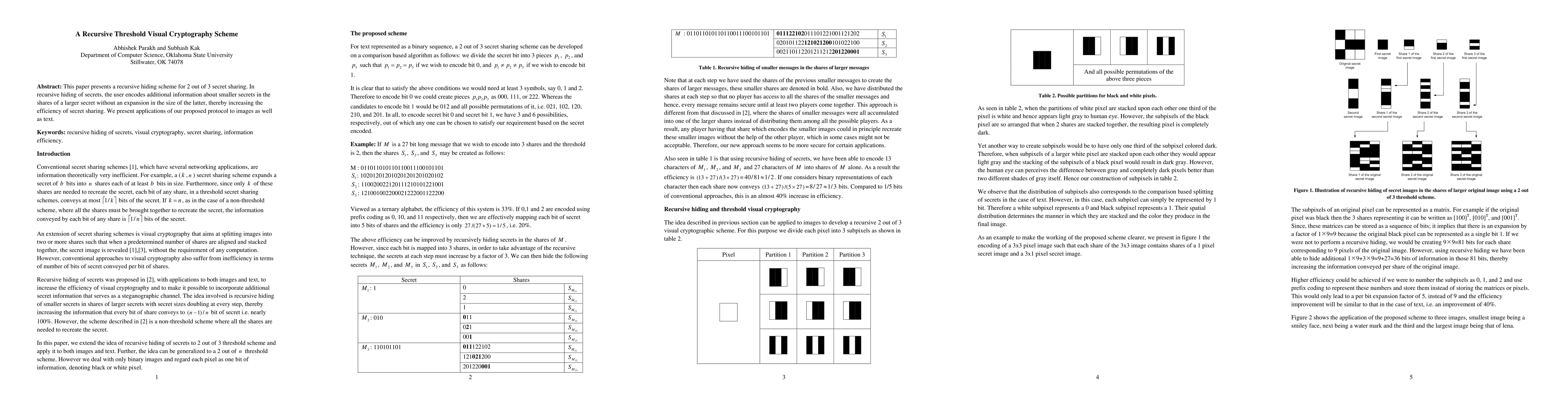 This paper introduces a recursive threshold visual cryptography scheme for sharing secrets among 2 out of 3 participants, enhancing efficiency by encoding additional information without increasing the size of the larger secret. The proposed protocol is demonstrated through applications in both image and text secret sharing.