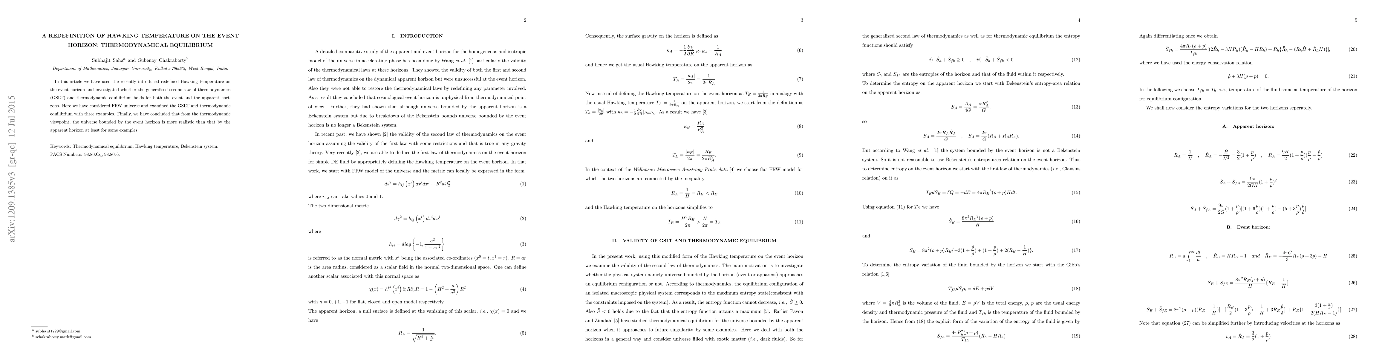 This paper redefines the Hawking temperature on the event horizon and examines whether the generalised second law of thermodynamics and thermodynamic equilibrium hold for both event and apparent horizons in a FRW universe. The study concludes that the universe bounded by the event horizon is more thermodynamically realistic than that by the apparent horizon in certain cases.