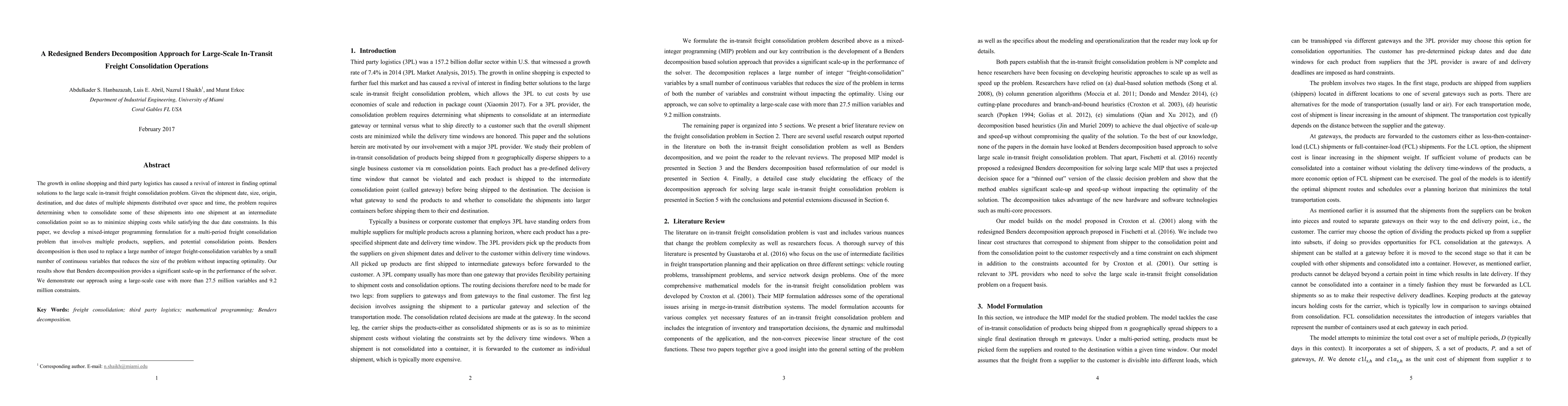 This paper proposes a redesigned Benders decomposition approach to solve large-scale in-transit freight consolidation problems, optimizing shipment consolidation to minimize costs while meeting due dates. The method effectively reduces problem size and improves solver performance, demonstrated through a case with over 27.5 million variables and 9.2 million constraints.
