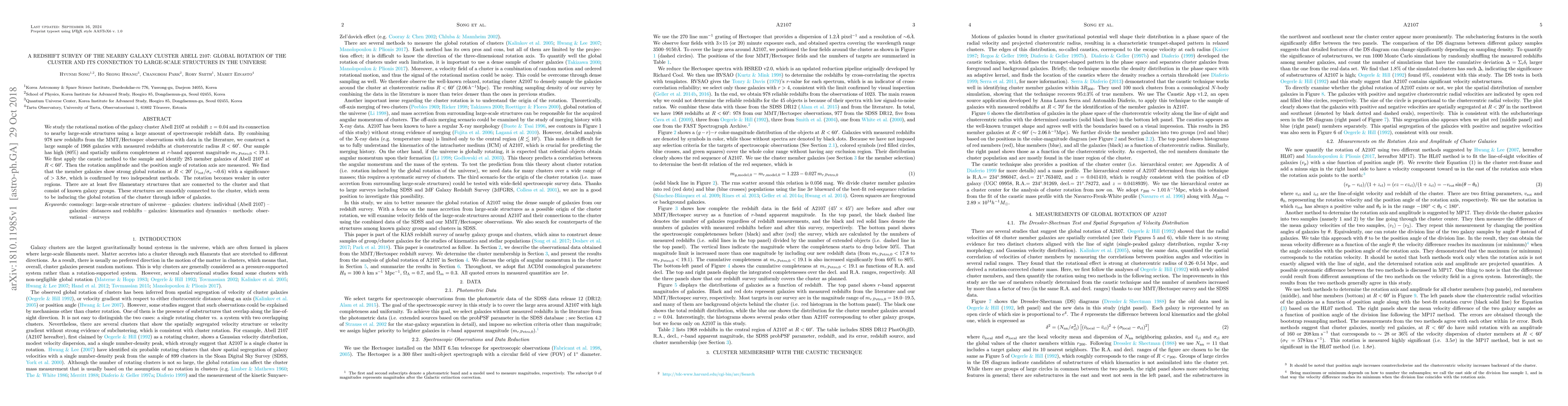 We study the rotational motion of the galaxy cluster Abell 2107 at redshift z = 0.04 and its connection to nearby large-scale structures using a large amount of spectroscopic redshift data. By combining 978 new redshifts from the MMT/Hectospec observations with data in the literature, we construct a large sample of 1968 galaxies with measured redshifts at clustercentric radius $R < 60^\prime$. Our sample has high (80%) and spatially uniform completeness at r-band apparent magnitude $m_{r,\textrm{Petro},0}$ < 19.1. We first apply the caustic method to the sample and identify 285 member galaxies of Abell 2107 at $R < 60^\prime$. Then the rotation amplitude and the position angle of rotation axis are measured. We find that the member galaxies show strong global rotation at $R < 20^\prime$ ($v_\textrm{rot}/\sigma_v$ ~0.6) with a significance of > 3.8$\sigma$, which is confirmed by two independent methods. The rotation becomes weaker in outer regions. There are at least five filamentary structures that are connected to the cluster and that consist of known galaxy groups. These structures are smoothly connected to the cluster, which seem to be inducing the global rotation of the cluster through inflow of galaxies.