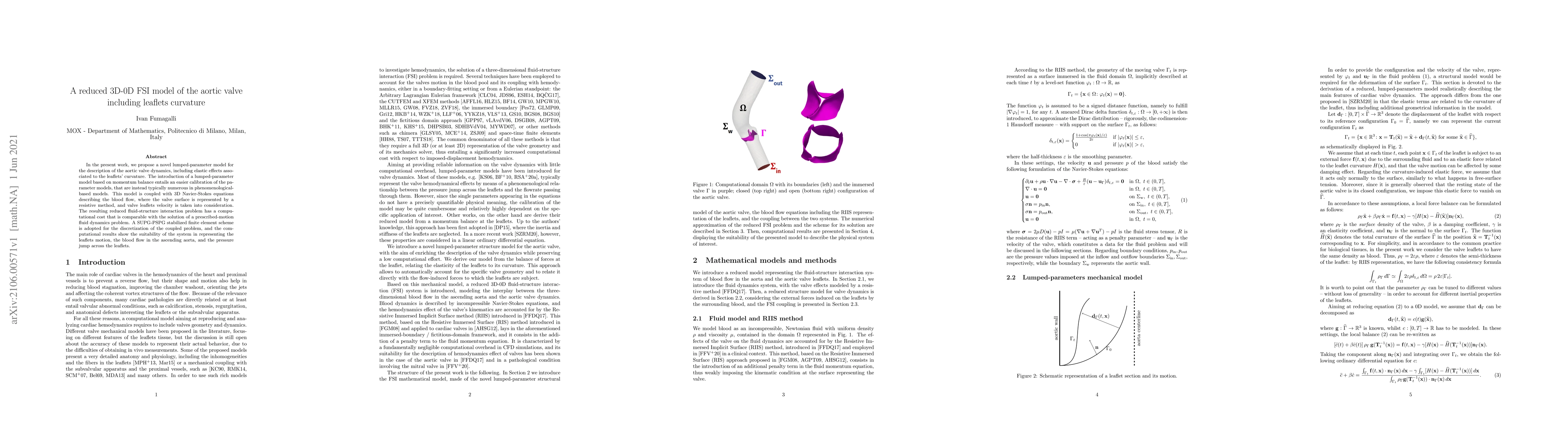 In the present work, we propose a novel lumped-parameter model for the description of the aortic valve dynamics, including elastic effects associated to the leaflets' curvature. The introduction of a lumped-parameter model based on momentum balance entails an easier calibration of the parameter models, that are instead typically numerous in phenomenological-based models. This model is coupled with 3D Navier-Stokes equations describing the blood flow, where the valve surface is represented by a resistive method, and valve leaflets velocity is taken into consideration. The resulting reduced fluid-structure interaction problem has a computational cost that is comparable with the solution of a prescribed-motion fluid dynamics problem. A SUPG-PSPG stabilized finite element scheme is adopted for the discretization of the coupled problem, and the computational results show the suitability of the system in representing the leaflets motion, the blood flow in the ascending aorta, and the pressure jump across the leaflets.