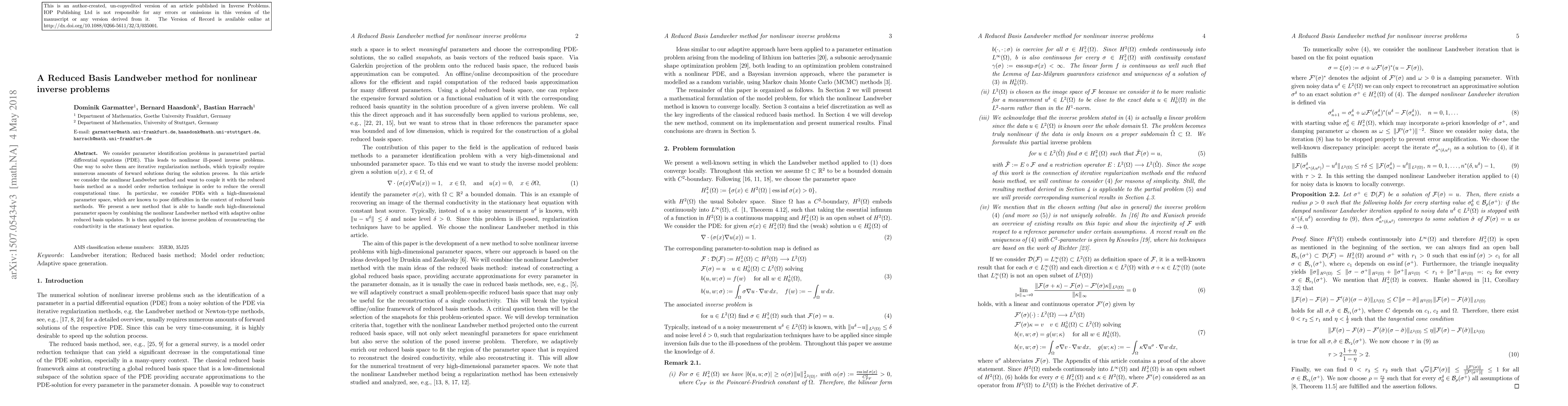 This paper proposes a Reduced Basis Landweber method to solve nonlinear inverse problems in high-dimensional parameter spaces of PDEs. It combines the nonlinear Landweber method with adaptive online reduced basis updates to significantly reduce computational time. The method is demonstrated through the inverse problem of reconstructing conductivity in the stationary heat equation.