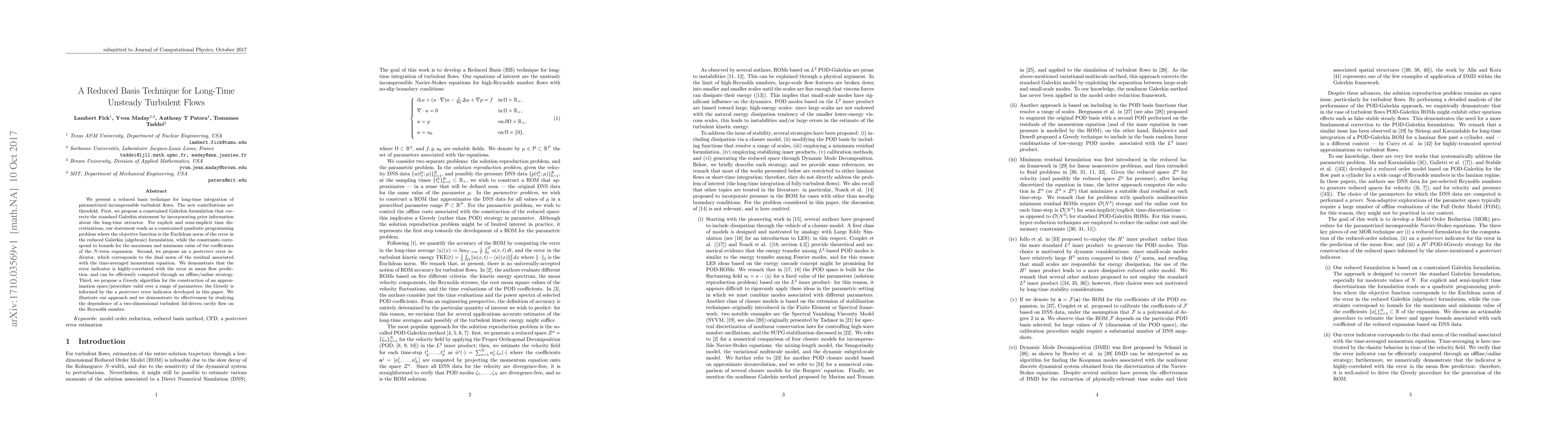 We present a reduced basis technique for long-time integration of parametrized incompressible turbulent flows. The new contributions are threefold. First, we propose a constrained Galerkin formulation that corrects the standard Galerkin statement by incorporating prior information about the long-time attractor. For explicit and semi-implicit time discretizations, our statement reads as a constrained quadratic programming problem where the objective function is the Euclidean norm of the error in the reduced Galerkin (algebraic) formulation, while the constraints correspond to bounds for the maximum and minimum value of the coefficients of the $N$-term expansion. Second, we propose an \emph{a posteriori} error indicator, which corresponds to the dual norm of the residual associated with the time-averaged momentum equation. We demonstrate that the error indicator is highly-correlated with the error in mean flow prediction, and can be efficiently computed through an offline/online strategy. Third, we propose a Greedy algorithm for the construction of an approximation space/procedure valid over a range of parameters; the Greedy is informed by the \emph{a posteriori} error indicator developed in this paper. We illustrate our approach and we demonstrate its effectiveness by studying the dependence of a two-dimensional turbulent lid-driven cavity flow on the Reynolds number.