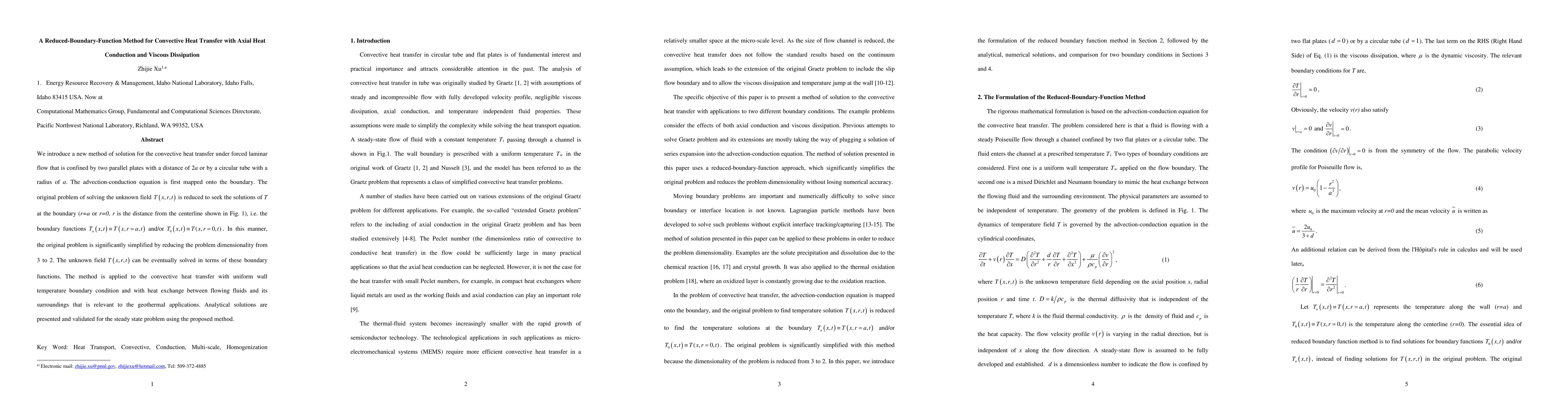 This paper proposes a reduced-boundary-function method to simplify the solution of convective heat transfer problems in forced laminar flow between parallel plates or in a circular tube, focusing on axial heat conduction and viscous dissipation. The method reduces the problem from three dimensions to two by solving boundary functions, providing an analytical solution validated for steady-state conditions relevant to geothermal applications.