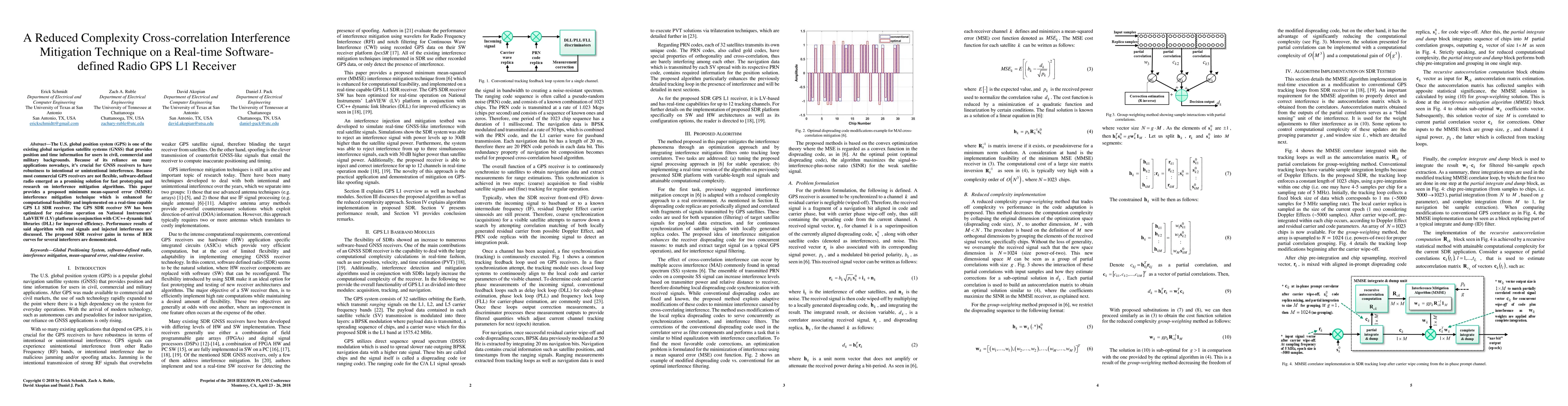 This paper proposes a reduced complexity cross-correlation interference mitigation technique for a real-time software-defined radio (SDR) GPS L1 receiver, implemented on a National Instruments' LabVIEW platform with C/C++ libraries. The technique demonstrates improved performance in terms of bit error rate (BER) under real signal and interference conditions.
