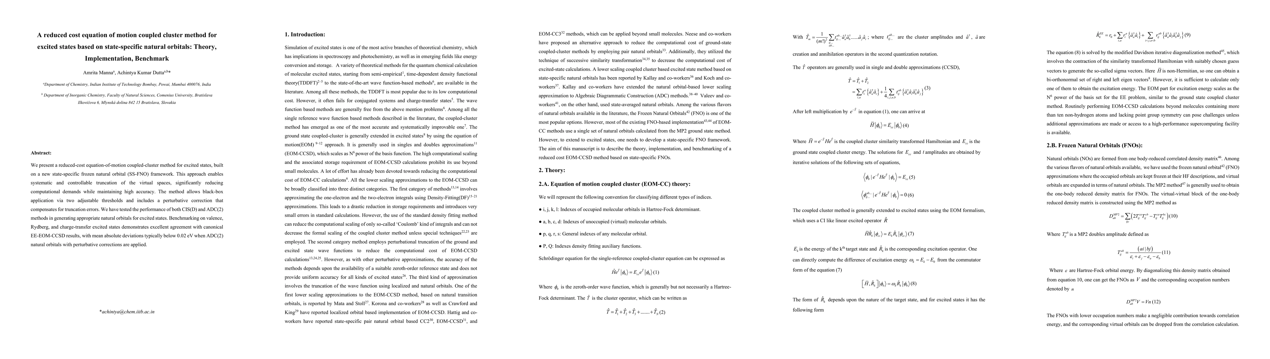 The paper introduces a cost-effective equation-of-motion coupled-cluster method for excited states using state-specific natural orbitals. This method reduces computational demands while preserving accuracy, with successful benchmarking against high-level EE-EOM-CCSD results, showing mean absolute deviations below 0.02 eV.