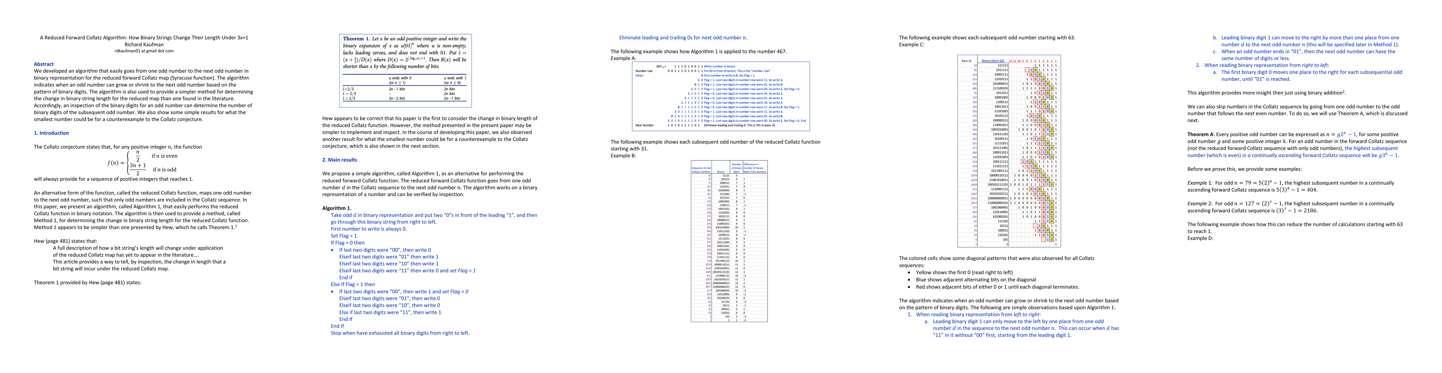 We developed an algorithm that easily goes from one odd number to the next odd number in binary representation for the reduced forward Collatz map (Syracuse function). The algorithm indicates when an odd number can grow or shrink to the next odd number based on the pattern of binary digits. The algorithm is also used to provide a simpler method for determining the change in binary string length for the reduced map than one found in the literature. Accordingly, an inspection of the binary digits for an odd number can determine the number of binary digits of the subsequent odd number. We also show some simple results for what the smallest number could be for a counterexample to the Collatz conjecture.