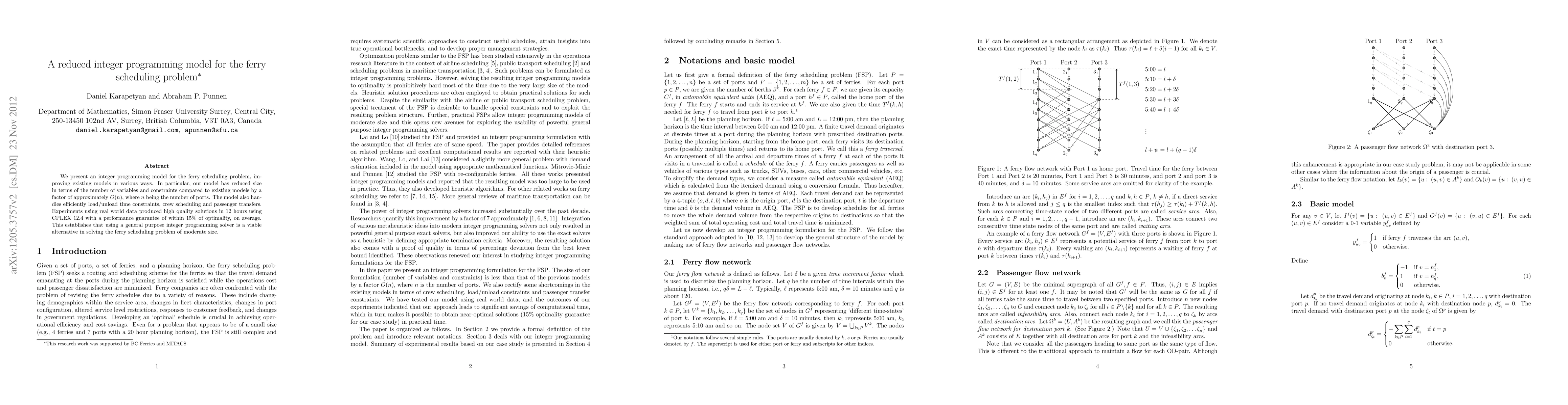 An integer programming model was developed to solve the ferry scheduling problem, considering various constraints such as passenger transfer, loading/unloading time, and crew scheduling.