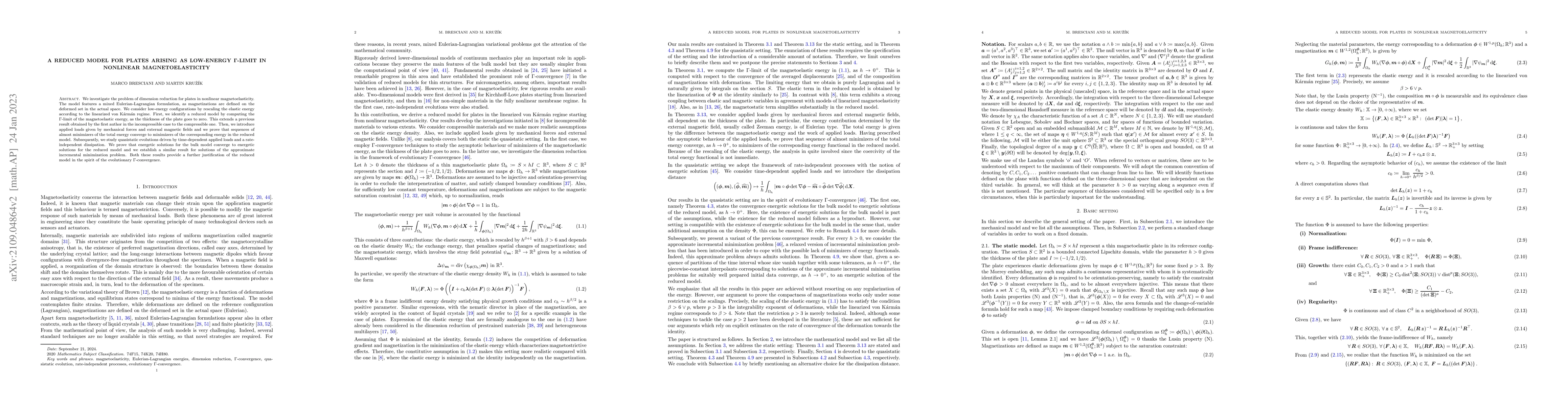 We investigate the problem of dimension reduction for plates in nonlinear magnetoelasticity. The model features a mixed Eulerian-Lagrangian formulation, as magnetizations are defined on the deformed set in the actual space. We consider low-energy configurations by rescaling the elastic energy according to the linearized von K\'{a}rm\'{a}n regime. First, we identify a reduced model by computing the $\Gamma$-limit of the magnetoelastic energy, as the thickness of the plate goes to zero. This extends a previous result obtained by the first author in the incompressible case to the compressible one. Then, we introduce applied loads given by mechanical forces and external magnetic fields and we prove that, under clamped boundary conditions, sequences of almost minimizes of the total energy converge to minimizers of the corresponding energy in the reduced model. Subsequently, we study quasistatic evolutions driven by time-dependent applied loads and a rate-independent dissipation. We prove that solutions to the approximate incremental minimization problem at the bulk converge to energetic solutions to the reduced model. This result provides a further justification of the latter in the spirit of evolutionary $\Gamma$-convergence.