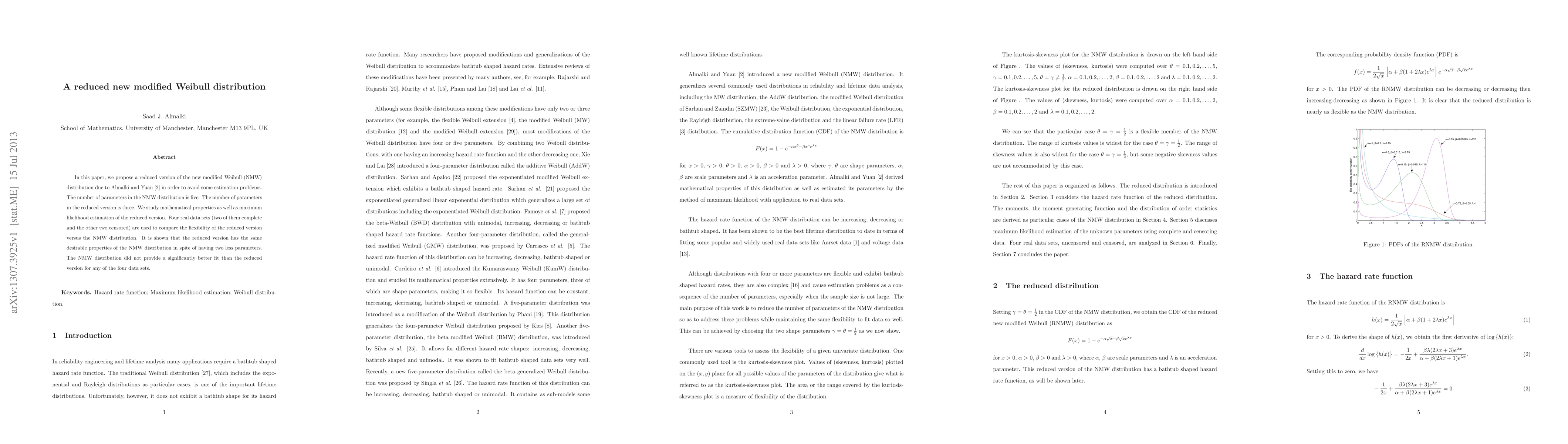 In this paper, we propose a reduced version of the new modified Weibull (NMW) distribution due to Almalki and Yuan \cite{meNMW} in order to avoid some estimation problems. The number of parameters in the NMW distribution is five. The number of parameters in the reduced version is three. We study mathematical properties as well as maximum likelihood estimation of the reduced version. Four real data sets (two of them complete and the other two censored) are used to compare the flexibility of the reduced version versus the NMW distribution. It is shown that the reduced version has the same desirable properties of the NMW distribution in spite of having two less parameters. The NMW distribution did not provide a significantly better fit than the reduced version for any of the four data sets.