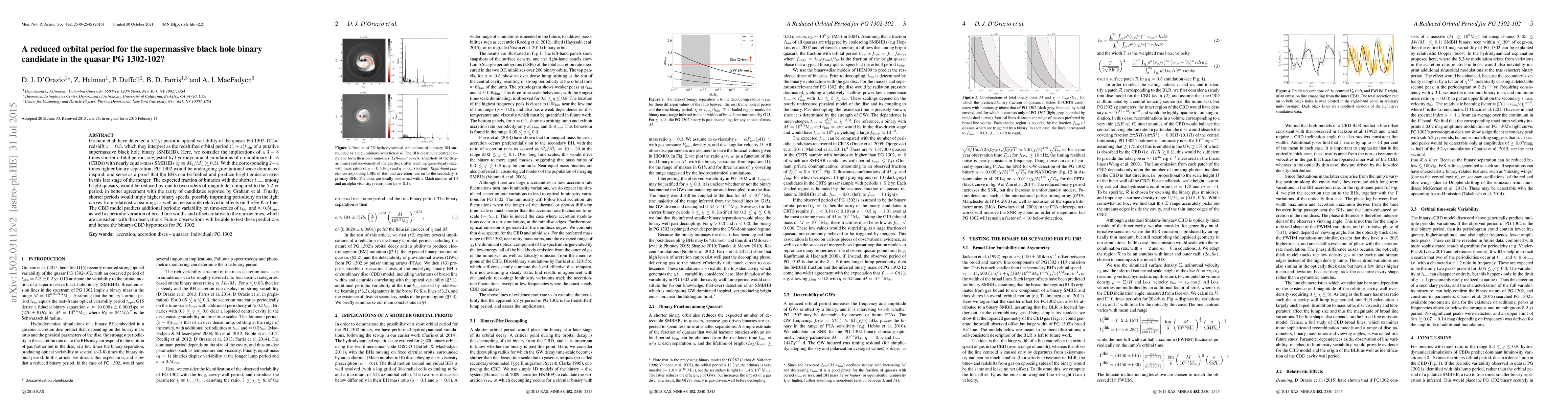 Graham et al. (2015) have detected a 5.2 year periodic optical variability of the quasar PG 1302-102 at redshift $z=0.3$, which they interpret as the redshifted orbital period $(1+z)t_{\rm bin}$ of a putative supermassive black hole binary (SMBHB). Here we consider the implications of a $3-8$ times shorter orbital period, suggested by hydrodynamical simulations of circumbinary discs (CBDs) with nearly equal--mass SMBHBs ($q\equiv M_2/M_1\gtrsim 0.3$). With the corresponding $2-4$ times tighter binary separation, PG 1302 would be undergoing gravitational wave dominated inspiral, and serve as a proof that the BHs can be fueled and produce bright emission even in this late stage of the merger. The expected fraction of binaries with the shorter $t_{\rm bin}$, among bright quasars, would be reduced by 1-2 orders of magnitude, compared to the 5.2 year period, in better agreement with the rarity of candidates reported by Graham et al. (2015). Finally, shorter periods would imply higher binary speeds, possibly imprinting periodicity on the light curves from relativistic beaming, as well as measurable relativistic effects on the Fe K$\alpha$ line. The CBD model predicts additional periodic variability on timescales of $t_{\rm bin}$ and $\approx 0.5 t_{\rm bin}$, as well as periodic variation of broad line widths and offsets relative to the narrow lines, which are consistent with the observations. Future observations will be able to test these predictions and hence the binary+CBD hypothesis for PG 1302.