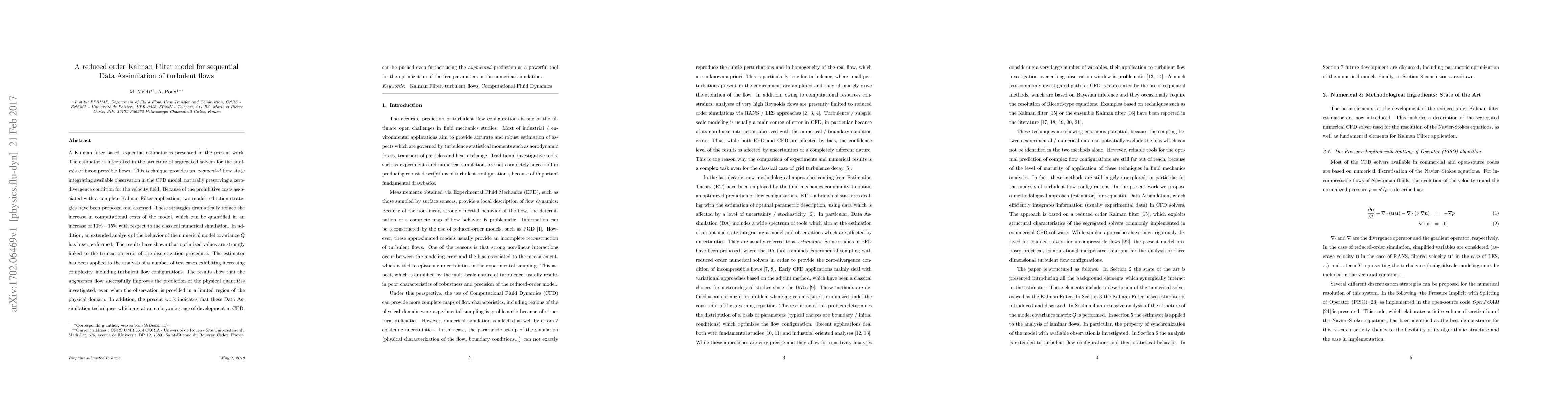 A Kalman filter based sequential estimator is presented in the present work. The estimator is integrated in the structure of segregated solvers for the analysis of incompressible flows. This technique provides an augmented flow state integrating available observation in the CFD model, naturally preserving a zero-divergence condition for the velocity field. Because of the prohibitive costs associated with a complete Kalman Filter application, two model reduction strategies have been proposed and assessed. These strategies dramatically reduce the increase in computational costs of the model, which can be quantified in an increase of $10\% - 15\%$ with respect to the classical numerical simulation. In addition, an extended analysis of the behavior of the numerical model covariance $Q$ has been performed. The results have shown that optimized values are strongly linked to the truncation error of the discretization procedure. The estimator has been applied to the analysis of a number of test cases exhibiting increasing complexity, including turbulent flow configurations. The results show that the augmented flow successfully improves the prediction of the physical quantities investigated, even when the observation is provided in a limited region of the physical domain. In addition, the present work indicates that these Data Assimilation techniques, which are at an embryonic stage of development in CFD, can be pushed even further using the augmented prediction as a powerful tool for the optimization of the free parameters in the numerical simulation.