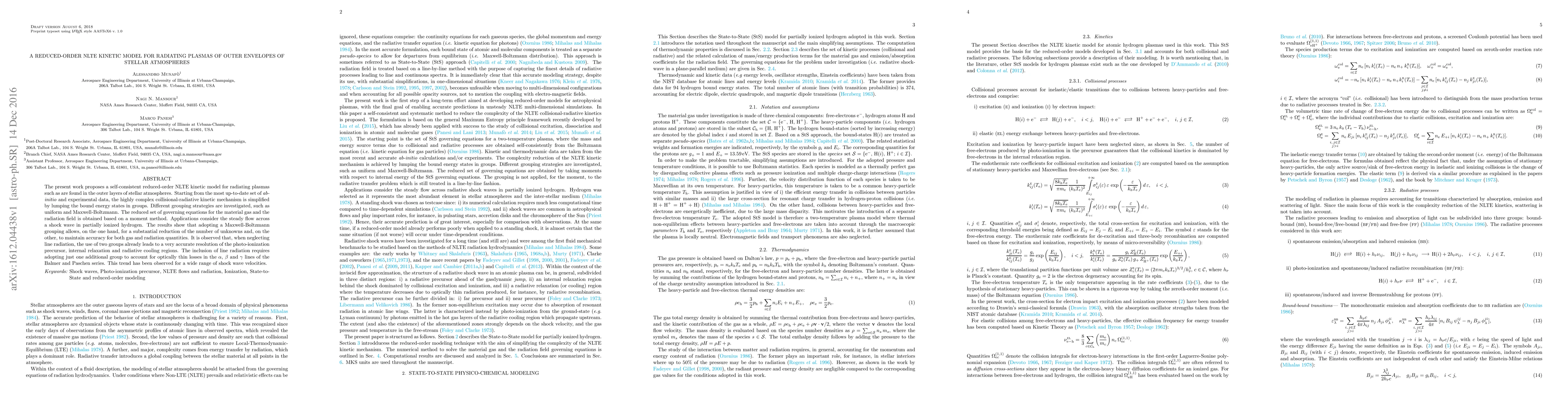 The present work proposes a self-consistent reduced-order NLTE kinetic model for radiating plasmas such as are found in the outer layers of stellar atmospheres. Starting from the most up-to-date set of ab-initio and experimental data, the highly complex collisional-radiative kinetic mechanism is simplified by lumping the bound energy states in groups. Different grouping strategies are investigated, such as uniform and Maxwell-Boltzmann. The reduced set of governing equations for the material gas and the radiation field is obtained based on a moment method. Applications consider the steady flow across a shock wave in partially ionized hydrogen. The results show that adopting a Maxwell-Boltzmann grouping allows, on the one hand, for a substantial reduction of the number of unknowns and, on the other, to maintain accuracy for both gas and radiation quantities. It is observed that, when neglecting line radiation, the use of two groups already leads to a very accurate resolution of the photo-ionization precursor, internal relaxation and radiative cooling regions. The inclusion of line radiation requires adopting just one additional group to account for optically thin losses in the alpha, beta and gamma lines of the Balmer and Paschen series. This trend has been observed for a wide range of shock wave velocities.