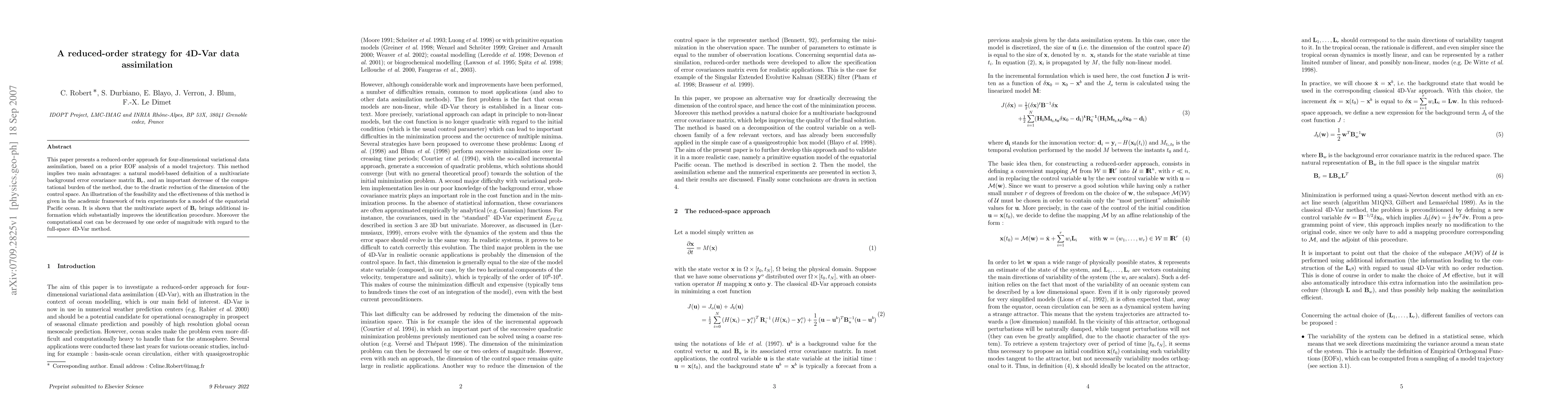 This paper presents a reduced-order approach for four-dimensional variational data assimilation, based on a prior EO F analysis of a model trajectory. This method implies two main advantages: a natural model-based definition of a mul tivariate background error covariance matrix $\textbf{B}_r$, and an important decrease of the computational burden o f the method, due to the drastic reduction of the dimension of the control space. % An illustration of the feasibility and the effectiveness of this method is given in the academic framework of twin experiments for a model of the equatorial Pacific ocean. It is shown that the multivariate aspect of $\textbf{B}_r$ brings additional information which substantially improves the identification procedure. Moreover the computational cost can be decreased by one order of magnitude with regard to the full-space 4D-Var method.