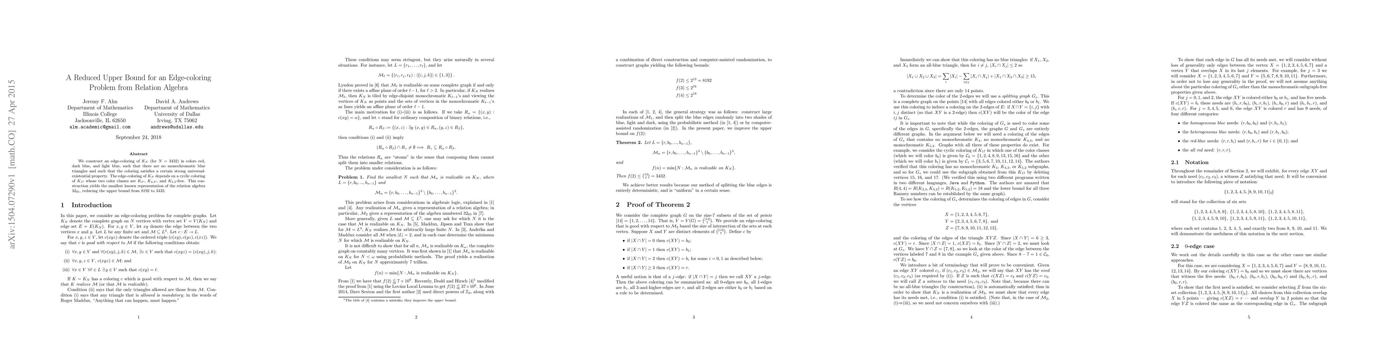 We construct an edge-coloring of $K_{N}$ (for $N = 3432$) in colors red, dark blue, and light blue, such that there are no monochromatic blue triangles and such that the coloring satisfies a certain strong universal-existential property. The edge-coloring of $K_{N}$ depends on a cyclic coloring of $K_{17}$ whose two color classes are $K_{4}$-, $K_{4,3}$-, and $K_{5,2}$-free. This construction yields the smallest known representation of the relation algebra $32_{65}$, reducing the upper bound from 8192 to 3432.