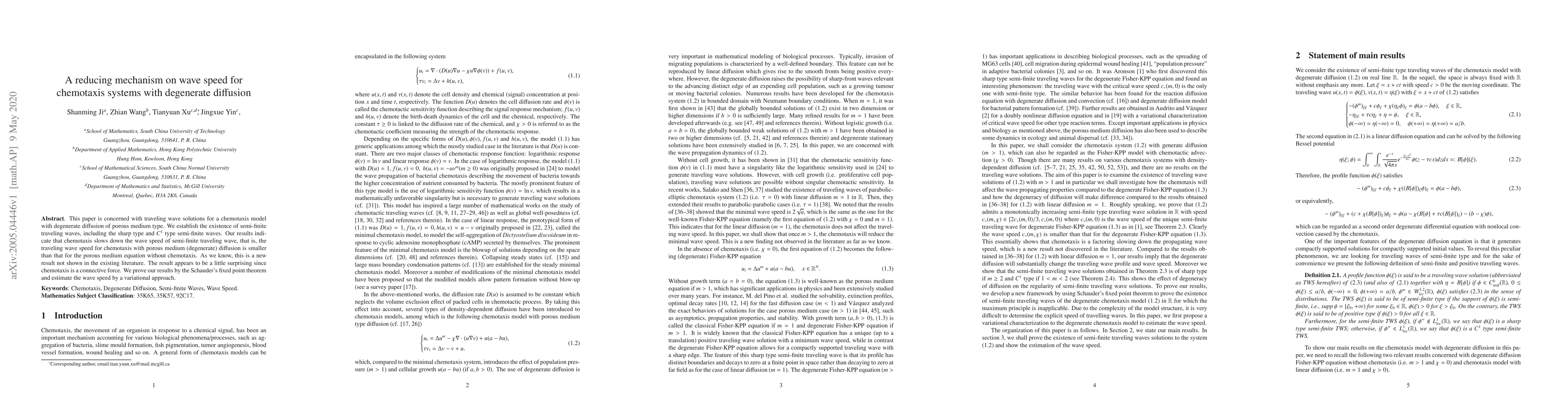 This paper investigates traveling wave solutions for chemotaxis models with degenerate diffusion, establishing the existence of semi-finite traveling waves, including sharp and $C^1$ types. It reveals that chemotaxis reduces wave speed compared to degenerate diffusion without chemotaxis, a surprising finding proven using Schauder's fixed point theorem and variational methods.