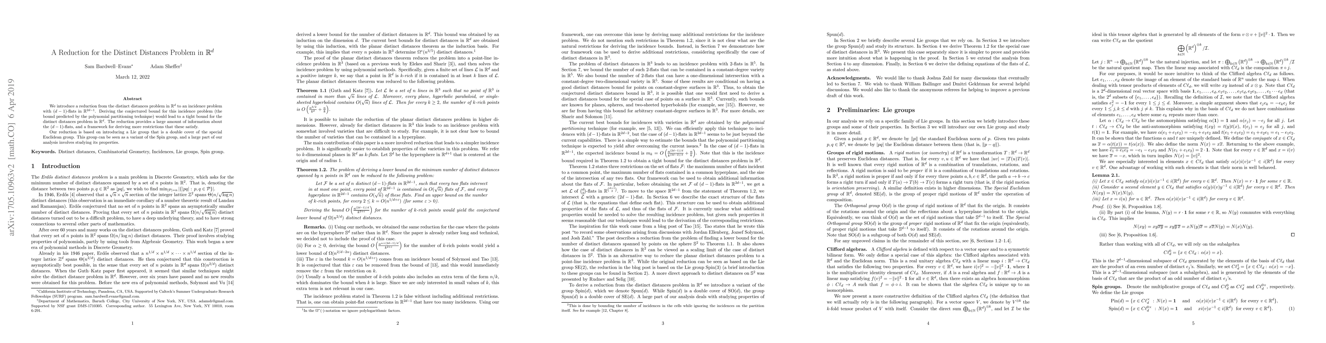 We introduce a reduction from the distinct distances problem in ${\mathbb R}^d$ to an incidence problem with $(d-1)$-flats in ${\mathbb R}^{2d-1}$. Deriving the conjectured bound for this incidence problem (the bound predicted by the polynomial partitioning technique) would lead to a tight bound for the distinct distances problem in ${\mathbb R}^d$. The reduction provides a large amount of information about the $(d-1)$-flats, and a framework for deriving more restrictions that these satisfy. Our reduction is based on introducing a Lie group that is a double cover of the special Euclidean group. This group can be seen as a variant of the Spin group, and a large part of our analysis involves studying its properties.