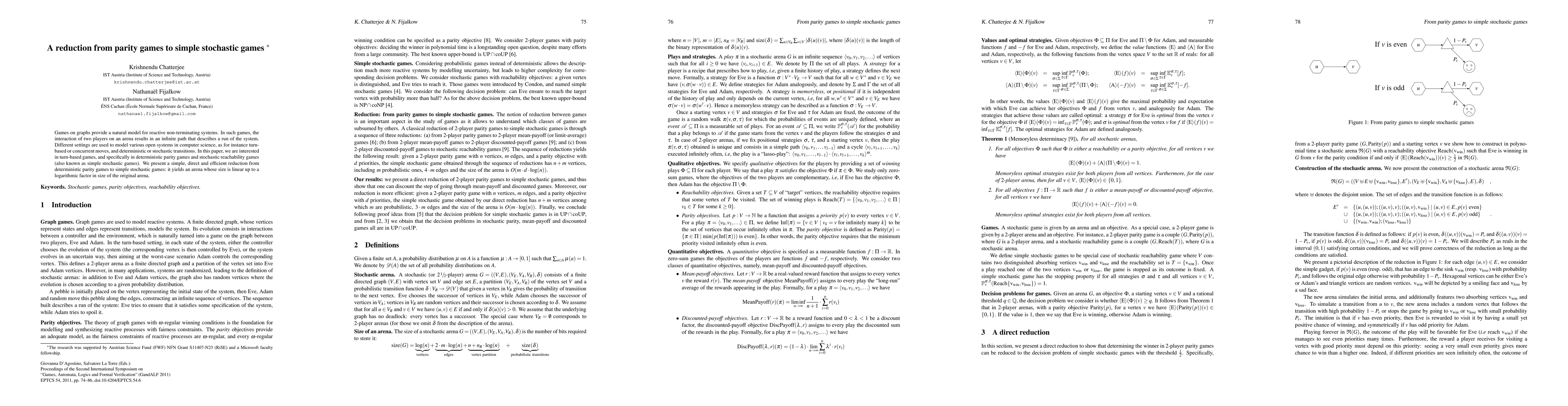 This paper presents an efficient reduction from deterministic parity games to simple stochastic games, resulting in an arena whose size is linear up to a logarithmic factor compared to the original. The method provides a straightforward transformation useful for the analysis of reactive non-terminating systems.