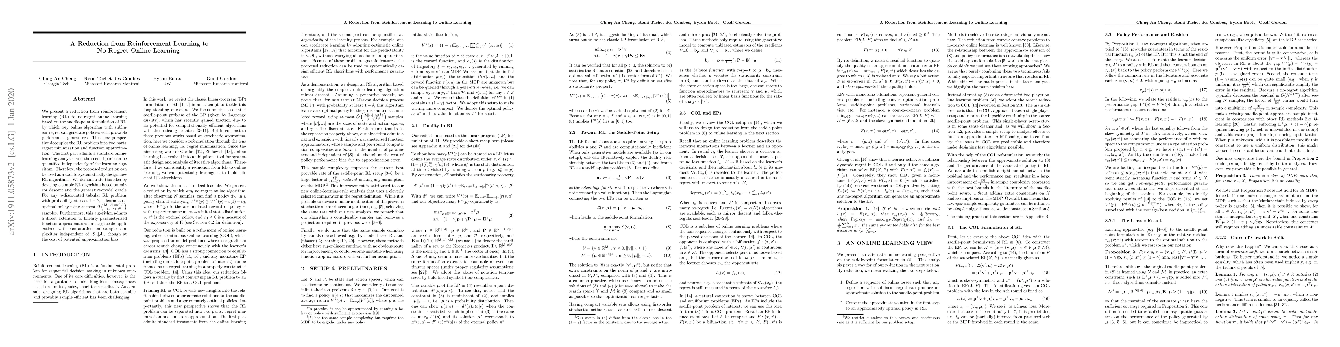 We present a reduction from reinforcement learning (RL) to no-regret online learning based on the saddle-point formulation of RL, by which "any" online algorithm with sublinear regret can generate policies with provable performance guarantees. This new perspective decouples the RL problem into two parts: regret minimization and function approximation. The first part admits a standard online-learning analysis, and the second part can be quantified independently of the learning algorithm. Therefore, the proposed reduction can be used as a tool to systematically design new RL algorithms. We demonstrate this idea by devising a simple RL algorithm based on mirror descent and the generative-model oracle. For any $\gamma$-discounted tabular RL problem, with probability at least $1-\delta$, it learns an $\epsilon$-optimal policy using at most $\tilde{O}\left(\frac{|\mathcal{S}||\mathcal{A}|\log(\frac{1}{\delta})}{(1-\gamma)^4\epsilon^2}\right)$ samples. Furthermore, this algorithm admits a direct extension to linearly parameterized function approximators for large-scale applications, with computation and sample complexities independent of $|\mathcal{S}|$,$|\mathcal{A}|$, though at the cost of potential approximation bias.