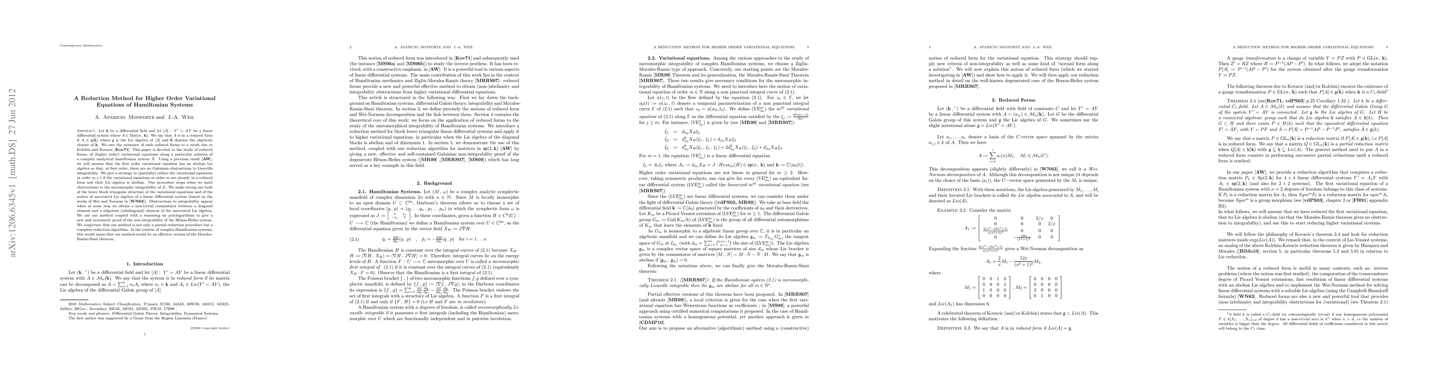 Let $\mathbf{k}$ be a differential field and let $[A]\,:\,Y'=A\,Y$ be a linear differential system where $A\in\mathrm{Mat}(n\,,\,\mathbf{k})$. We say that $A$ is in a reduced form if $A\in\mathfrak{g}(\bar{\mathbf{k}})$ where $\mathfrak{g}$ is the Lie algebra of $[A]$ and $\bar{\mathbf{k}}$ denotes the algebraic closure of $\mathbf{k}$. We owe the existence of such reduced forms to a result due to Kolchin and Kovacic \cite{Ko71a}. This paper is devoted to the study of reduced forms, of (higher order) variational equations along a particular solution of a complex analytical hamiltonian system $X$. Using a previous result \cite{ApWea}, we will assume that the first order variational equation has an abelian Lie algebra so that, at first order, there are no Galoisian obstructions to Liouville integrability. We give a strategy to (partially) reduce the variational equations at order $m+1$ if the variational equations at order $m$ are already in a reduced form and their Lie algebra is abelian. Our procedure stops when we meet obstructions to the meromorphic integrability of $X$. We make strong use both of the lower block triangular structure of the variational equations and of the notion of associated Lie algebra of a linear differential system (based on the works of Wei and Norman in \cite{WeNo63a}). Obstructions to integrability appear when at some step we obtain a non-trivial commutator between a diagonal element and a nilpotent (subdiagonal) element of the associated Lie algebra. We use our method coupled with a reasoning on polylogarithms to give a new and systematic proof of the non-integrability of the H\'enon-Heiles system. We conjecture that our method is not only a partial reduction procedure but a complete reduction algorithm. In the context of complex Hamiltonian systems, this would mean that our method would be an effective version of the Morales-Ramis-Sim\'o theorem.