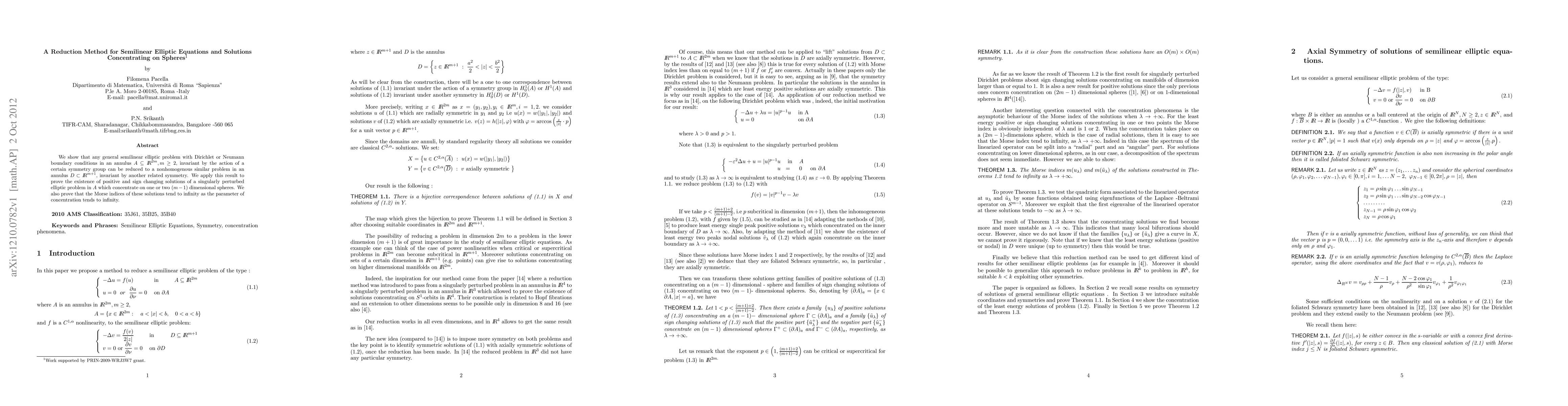 We show that any general semilinear elliptic problem with Dirichlet or Neumann boundary conditions in an annulus A in R^2m ;m >1, invariant by the action of a certain symmetry group can be reduced to a nonhomogenous similar problem in an annulus D in R^(m+1), invariant by another related symmetry. We apply this result to prove the existence of positive and sign changing solutions of a singularly perturbed elliptic problem in A which concentrate on one or two (m-1) dimensional spheres. We also prove that the Morse indices of these solutions tend to infinity as the parameter of concentration tends to infinity.