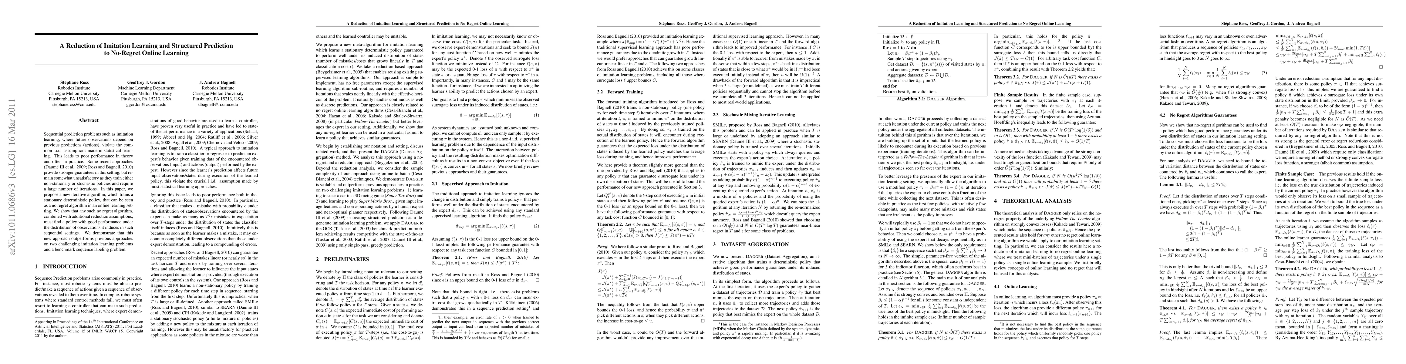 This paper proposes a new iterative algorithm for imitation learning that leverages no-regret online learning to train a stationary deterministic policy, achieving better performance than previous methods on imitation learning and sequence labeling tasks. The approach ensures good policy performance under the distribution of induced observations in sequential settings.