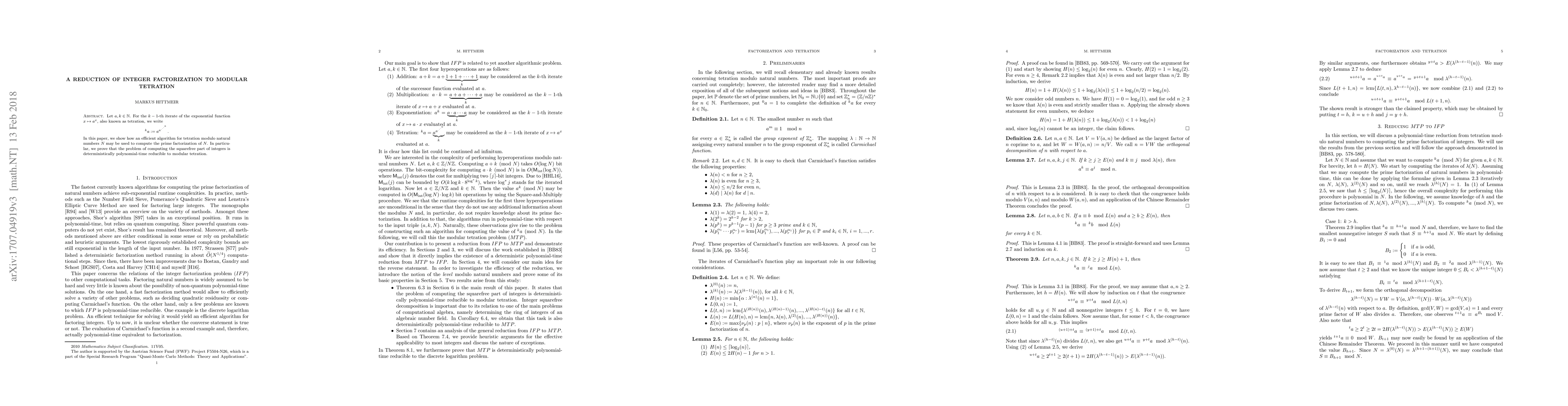 Let $a,k\in\mathbb{N}$. For the $k-1$-th iterate of the exponential function $x\mapsto a^x$, also known as tetration, we write \[ ^k a:=a^{a^{.^{.^{.^{a}}}}}. \] In this paper, we show how an efficient algorithm for tetration modulo natural numbers $N$ may be used to compute the prime factorization of $N$. In particular, we prove that the problem of computing the squarefree part of integers is deterministically polynomial-time reducible to modular tetration.