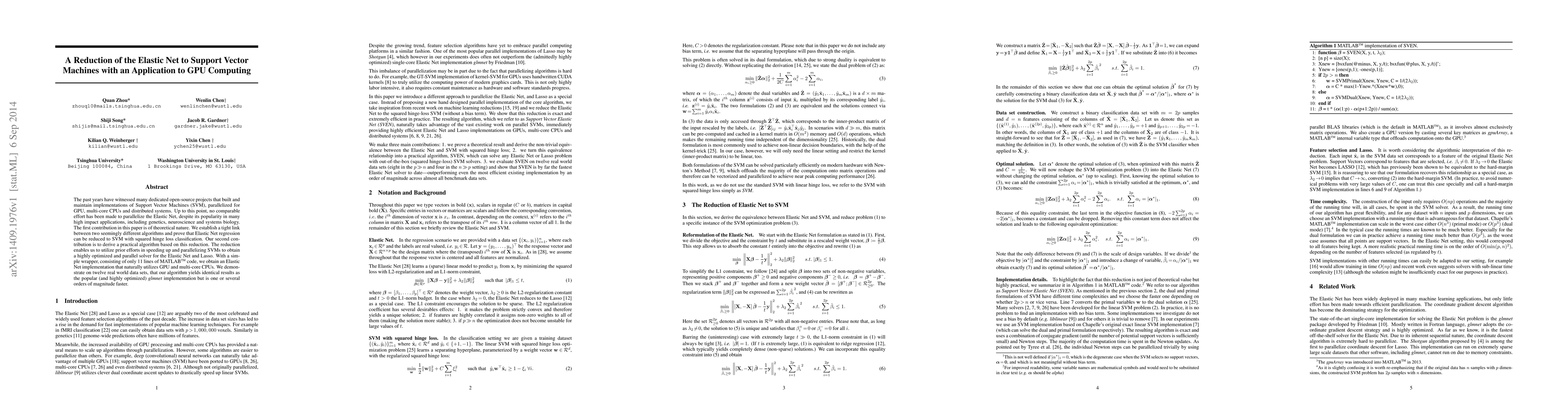This paper establishes a theoretical link between Elastic Net regression and Support Vector Machines (SVM) with squared hinge loss, enabling the parallelization of Elastic Net using existing GPU-optimized SVM implementations. The authors provide a simple 11-line MATLAB wrapper to achieve this, demonstrating significant speedups on real-world datasets compared to the glmnet implementation.