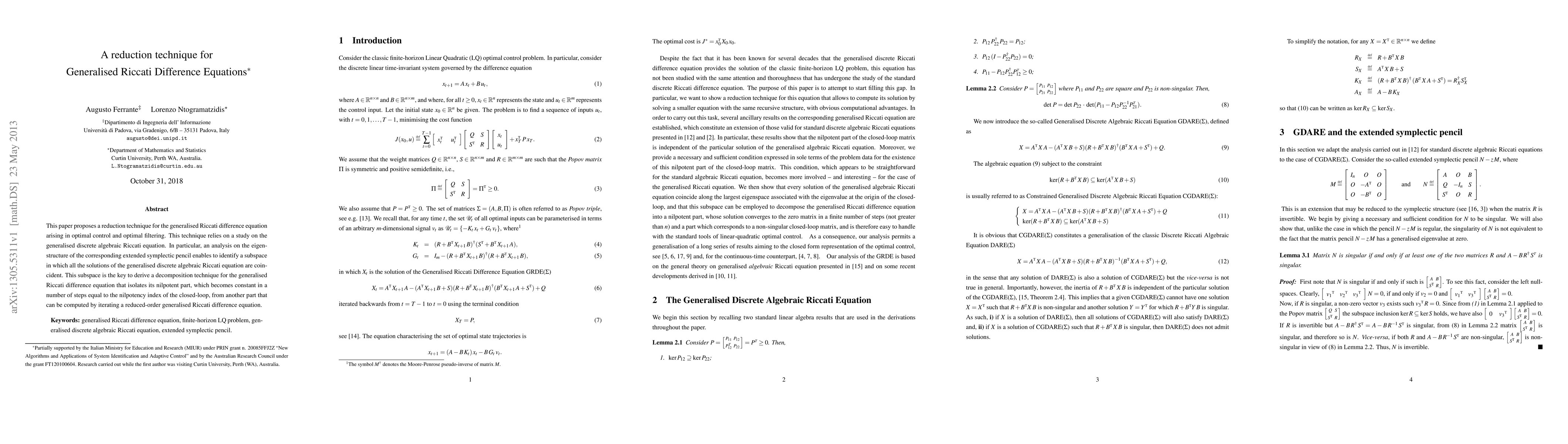 This paper proposes a reduction technique for the generalised Riccati difference equation arising in optimal control and optimal filtering. This technique relies on a study on the generalised discrete algebraic Riccati equation. In particular, an analysis on the eigen- structure of the corresponding extended symplectic pencil enables to identify a subspace in which all the solutions of the generalised discrete algebraic Riccati equation are coin- cident. This subspace is the key to derive a decomposition technique for the generalised Riccati difference equation that isolates its nilpotent part, which becomes constant in a number of steps equal to the nilpotency index of the closed-loop, from another part that can be computed by iterating a reduced-order generalised Riccati difference equation.