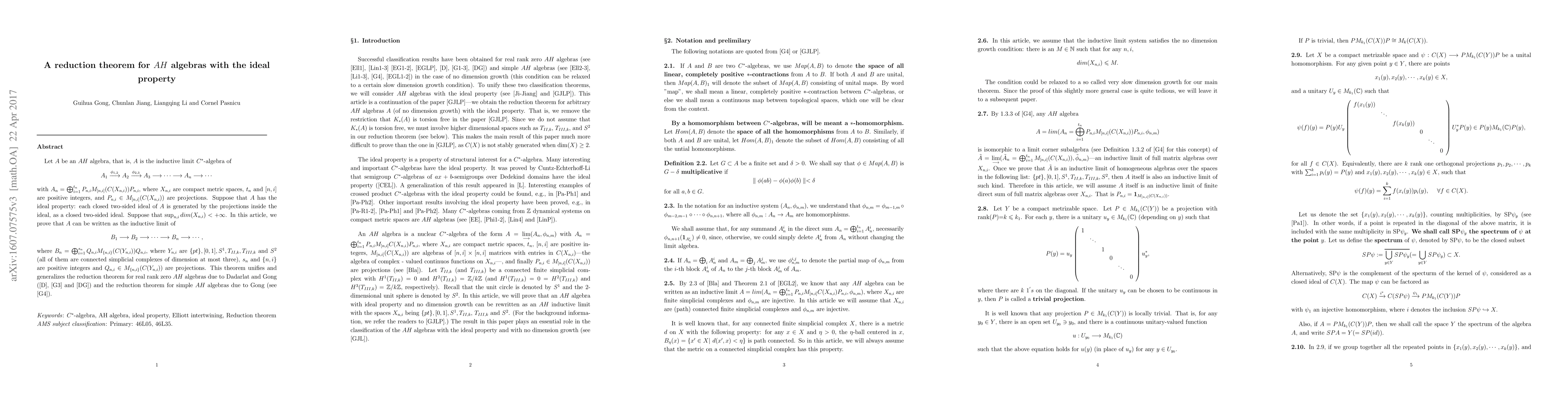 Let $A$ be an $AH$ algebra, that is, $A$ is the inductive limit $C^{*}$-algebra of $$A_{1}\xrightarrow{\phi_{1,2}}A_{2}\xrightarrow{\phi_{2,3}}A_{3}\longrightarrow\cdots\longrightarrow A_{n}\longrightarrow\cdots$$ with $A_{n}=\bigoplus_{i=1}^{t_{n}}P_{n,i}M_{[n,i]}(C(X_{n,i}))P_{n,i}$, where $X_{n,i}$ are compact metric spaces, $t_{n}$ and $[n,i]$ are positive integers, and $P_{n,i}\in M_{[n,i]}(C(X_{n,i}))$ are projections. Suppose that $A$ has the ideal property: each closed two-sided ideal of $A$ is generated by the projections inside the ideal, as a closed two-sided ideal. Suppose that $\sup_{n,i}dim(X_{n,i})<+\infty$. In this article, we prove that $A$ can be written as the inductive limit of $$B_{1}\longrightarrow B_{2}\longrightarrow\cdots\longrightarrow B_{n}\longrightarrow\cdots,$$ where $B_{n}=\bigoplus_{i=1}^{s_{n}}Q_{n,i}M_{\{n,i\}}(C(Y_{n,i}))Q_{n,i}$, where $Y_{n,i}$ are $\{pt\}$, $[0,1]$,$ S^{1}$,$ T_{II, k},$ $T_{III, k}$ and $S^{2}$ (all of them are connected simplicial complexes of dimension at most three), $s_{n}$ and $\{n,i\}$ are positive integers and $Q_{n,i}\in M_{\{n,i\}}(C(Y_{n,i}))$ are projections. This theorem unifies and generalizes the reduction theorem for real rank zero $AH$ algebras due to Dadarlat and Gong ([D], [G3] and [DG]) and the reduction theorem for simple $AH$ algebras due to Gong (see [G4]).