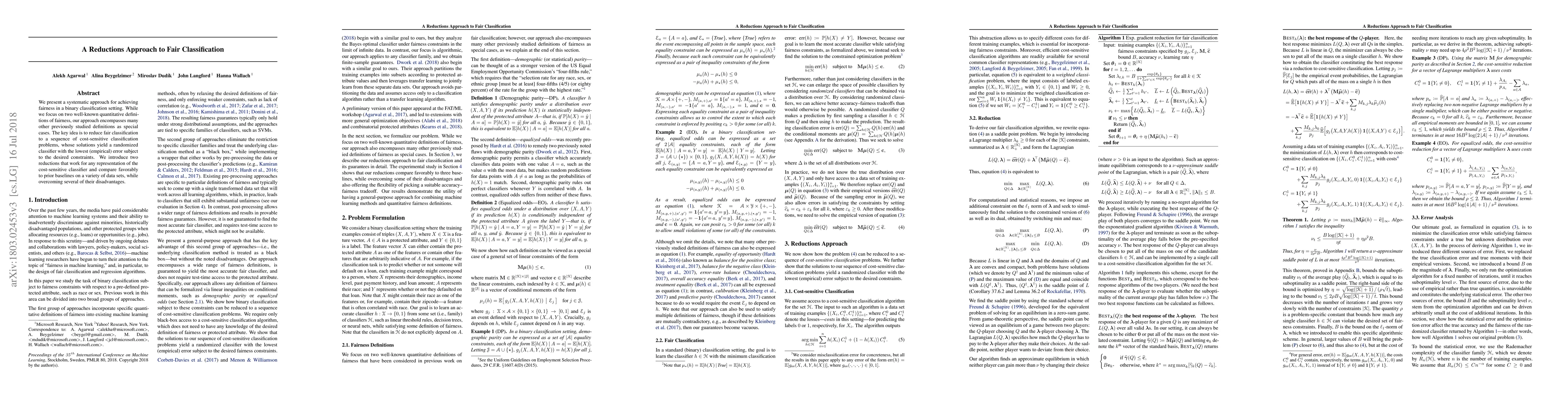 We present a systematic approach for achieving fairness in a binary classification setting. While we focus on two well-known quantitative definitions of fairness, our approach encompasses many other previously studied definitions as special cases. The key idea is to reduce fair classification to a sequence of cost-sensitive classification problems, whose solutions yield a randomized classifier with the lowest (empirical) error subject to the desired constraints. We introduce two reductions that work for any representation of the cost-sensitive classifier and compare favorably to prior baselines on a variety of data sets, while overcoming several of their disadvantages.
