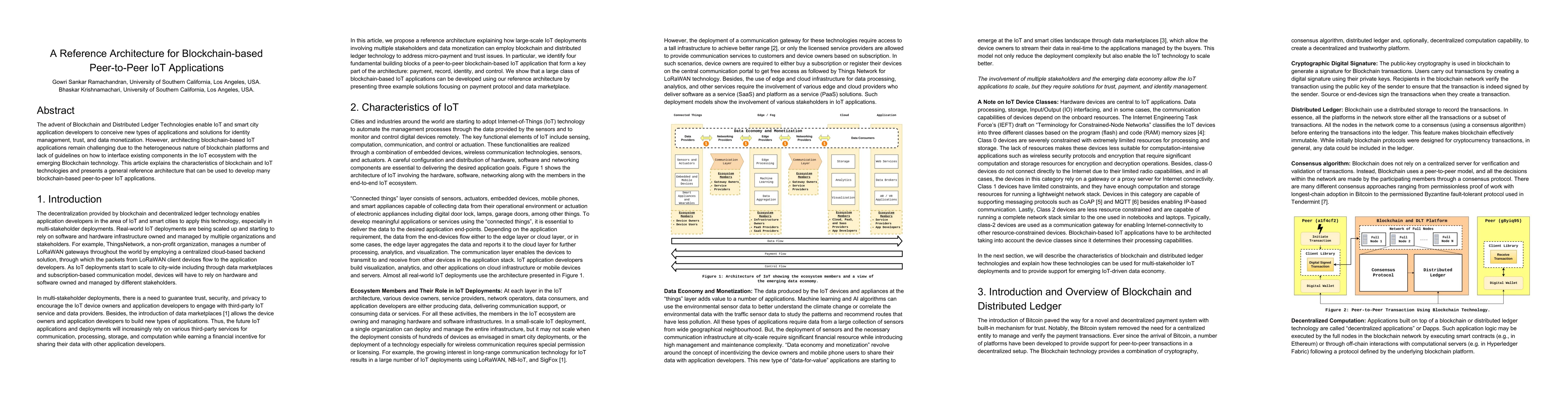 This paper introduces a reference architecture for blockchain-based peer-to-peer IoT applications, addressing the challenges posed by the heterogeneous nature of blockchain platforms and the lack of guidelines for integrating IoT components with blockchain technology. The proposed architecture aims to facilitate the development of blockchain-enabled IoT solutions for identity management, trust, and data monetization.