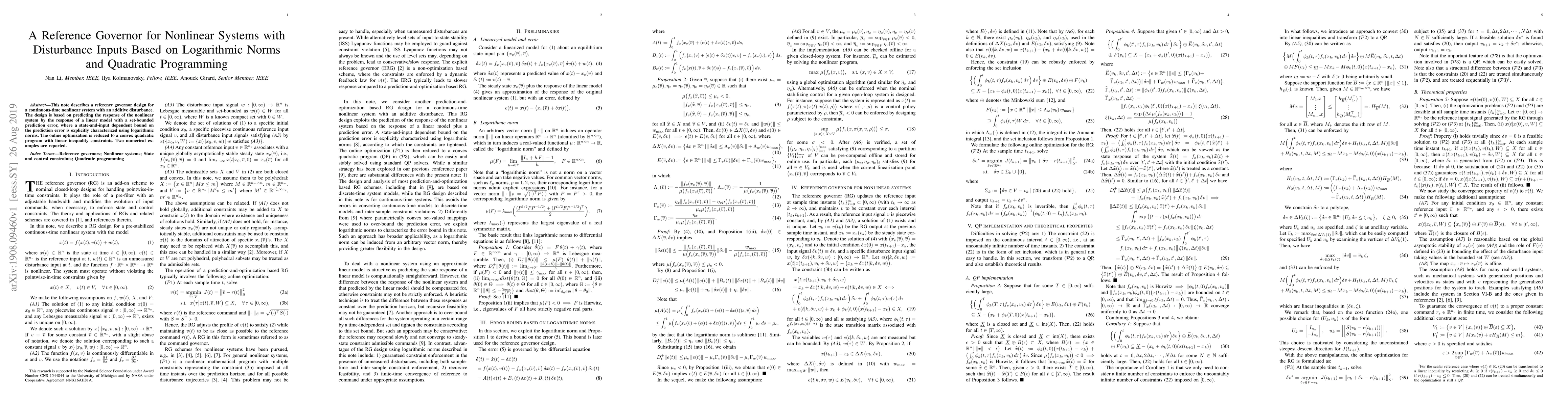 This paper proposes a reference governor for continuous-time nonlinear systems with disturbance inputs, using logarithmic norms to predict system responses and formulating the optimization as a convex quadratic program. The approach ensures a bounded prediction error and is demonstrated through two numerical examples.