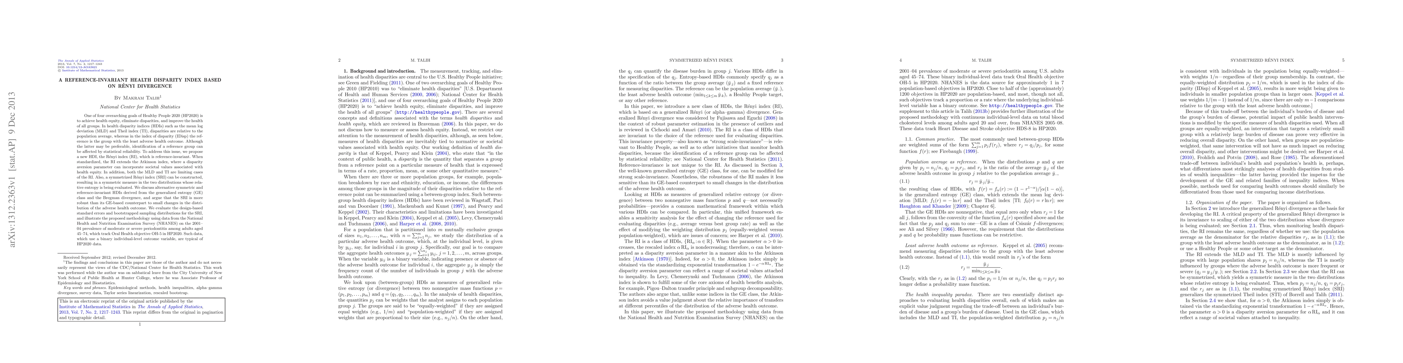 One of four overarching goals of Healthy People 2020 (HP2020) is to achieve health equity, eliminate disparities, and improve the health of all groups. In health disparity indices (HDIs) such as the mean log deviation (MLD) and Theil index (TI), disparities are relative to the population average, whereas in the index of disparity (IDisp) the reference is the group with the least adverse health outcome. Although the latter may be preferable, identification of a reference group can be affected by statistical reliability. To address this issue, we propose a new HDI, the R\'{e}nyi index (RI), which is reference-invariant. When standardized, the RI extends the Atkinson index, where a disparity aversion parameter can incorporate societal values associated with health equity. In addition, both the MLD and TI are limiting cases of the RI. Also, a symmetrized R\'{e}nyi index (SRI) can be constructed, resulting in a symmetric measure in the two distributions whose relative entropy is being evaluated. We discuss alternative symmetric and reference-invariant HDIs derived from the generalized entropy (GE) class and the Bregman divergence, and argue that the SRI is more robust than its GE-based counterpart to small changes in the distribution of the adverse health outcome. We evaluate the design-based standard errors and bootstrapped sampling distributions for the SRI, and illustrate the proposed methodology using data from the National Health and Nutrition Examination Survey (NHANES) on the 2001-04 prevalence of moderate or severe periodontitis among adults aged 45-74, which track Oral Health objective OH-5 in HP2020. Such data, which use a binary individual-level outcome variable, are typical of HP2020 data.