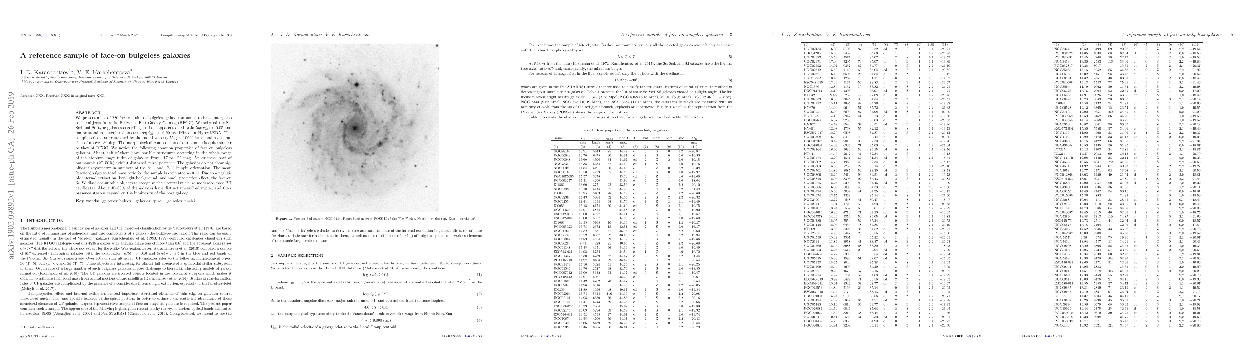 We present a list of 220 face-on, almost bulgeless galaxies assumed to be counterparts to the objects from the Reference Flat Galaxy Catalog (RFGC). We selected the Sc, Scd and Sd-type galaxies according to their apparent axial ratio $log(r_{25}) < 0.05$ and major standard angular diameter $log(d_{25}) > 0.90$ as defined in HyperLEDA. The sample objects are restricted by the radial velocity $V_{LG} < 10000$ km/s and a declination of above $-30$ deg. The morphological composition of our sample is quite similar to that of RFGC. We notice the following common properties of face-on bulgeless galaxies. About half of them have bar-like structures occurring in the whole range of the absolute magnitudes of galaxies: from $-17$ to $-22$ mag. An essential part of our sample (27-50%) exhibit distorted spiral patterns. The galaxies do not show significant asymmetry in numbers of the "S"- and "Z"-like spin orientation. The mean (pseudo)bulge-to-total mass ratio for the sample is estimated as 0.11. Due to a negligible internal extinction, low-light background, and small projection effect, the face-on Sc-Sd discs are suitable objects to recognize their central nuclei as moderate-mass BH candidates. About 40-60% of the galaxies have distinct unresolved nuclei, and their presence steeply depend on the luminosity of the host galaxy.