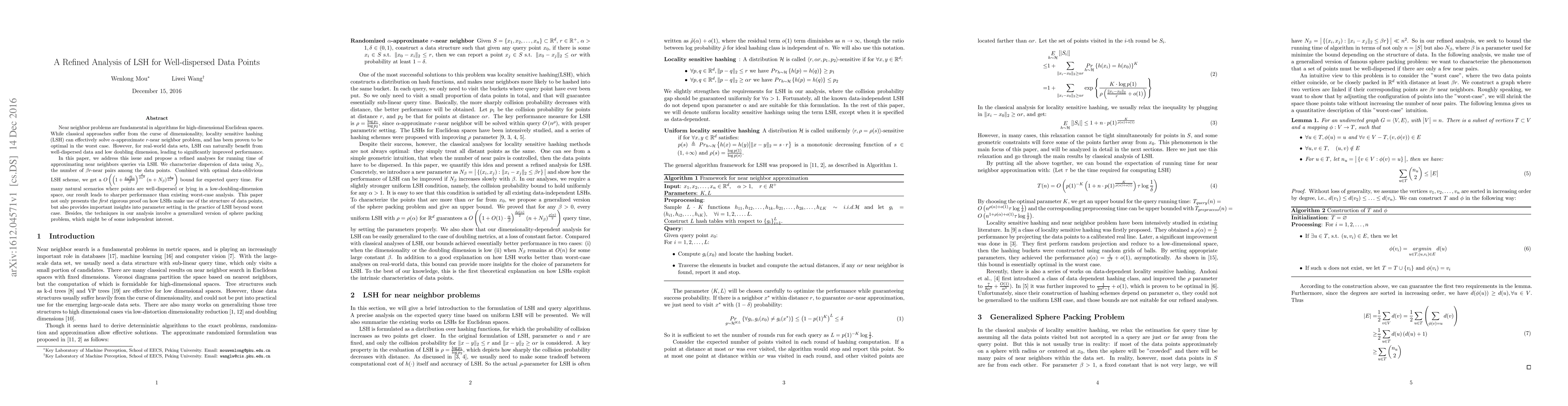 This paper refines the analysis of Locality Sensitive Hashing (LSH) for near neighbor problems in high-dimensional spaces, leveraging well-dispersed data and low doubling dimension to significantly improve query performance. It introduces a new query time bound based on N_b, the number of b*r-near pairs, and doubling dimension, offering sharper performance for real-world datasets and providing insights for practical LSH parameter setting.