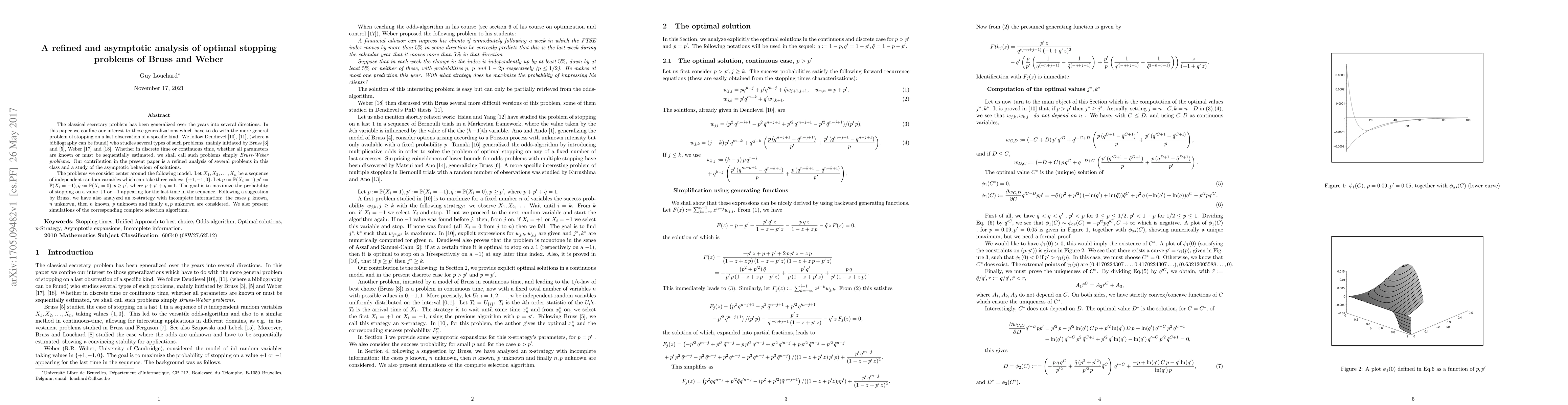 The classical secretary problem has been generalized over the years into several directions. In this paper we confine our interest to those generalizations which have to do with the more general problem of stopping on a last observation of a specific kind. We follow Dendievel, (where a bibliography can be found) who studies several types of such problems, mainly initiated by Bruss and Weber. Whether in discrete time or continuous time, whether all parameters are known or must be sequentially estimated, we shall call such problems simply "Bruss-Weber problems". Our contribution in the present paper is a refined analysis of several problems in this class and a study of the asymptotic behaviour of solutions. The problems we consider center around the following model. Let $X_1,X_2,\ldots,X_n$ be a sequence of independent random variables which can take three values: $\{+1,-1,0\}.$ Let $p:=\P(X_i=1), p':=\P(X_i=-1), \qt:=\P(X_i=0), p\geq p'$, where $p+p'+\qt=1$. The goal is to maximize the probability of stopping on a value $+1$ or $-1$ appearing for the last time in the sequence. Following a suggestion by Bruss, we have also analyzed an x-strategy with incomplete information: the cases $p$ known, $n$ unknown, then $n$ known, $p$ unknown and finally $n,p$ unknown are considered. We also present simulations of the corresponding complete selection algorithm.