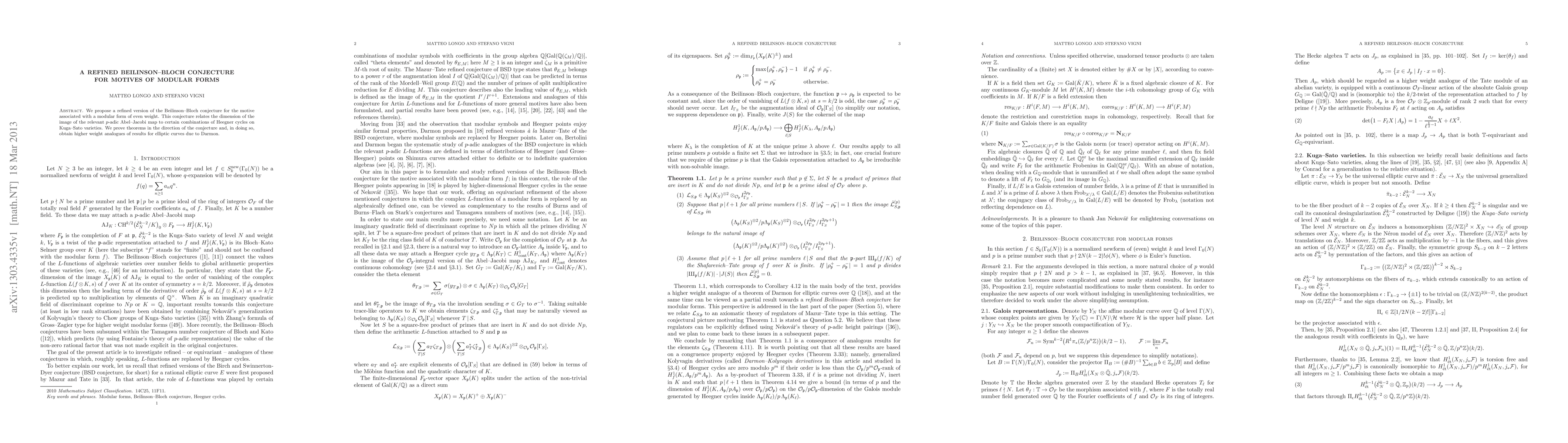 The paper proposes a refined version of the Beilinson-Bloch conjecture for motives of even weight modular forms, linking the dimension of the p-adic Abel-Jacobi map to Heegner cycles. It proves supporting theorems and establishes higher weight analogues of results previously obtained for elliptic curves.