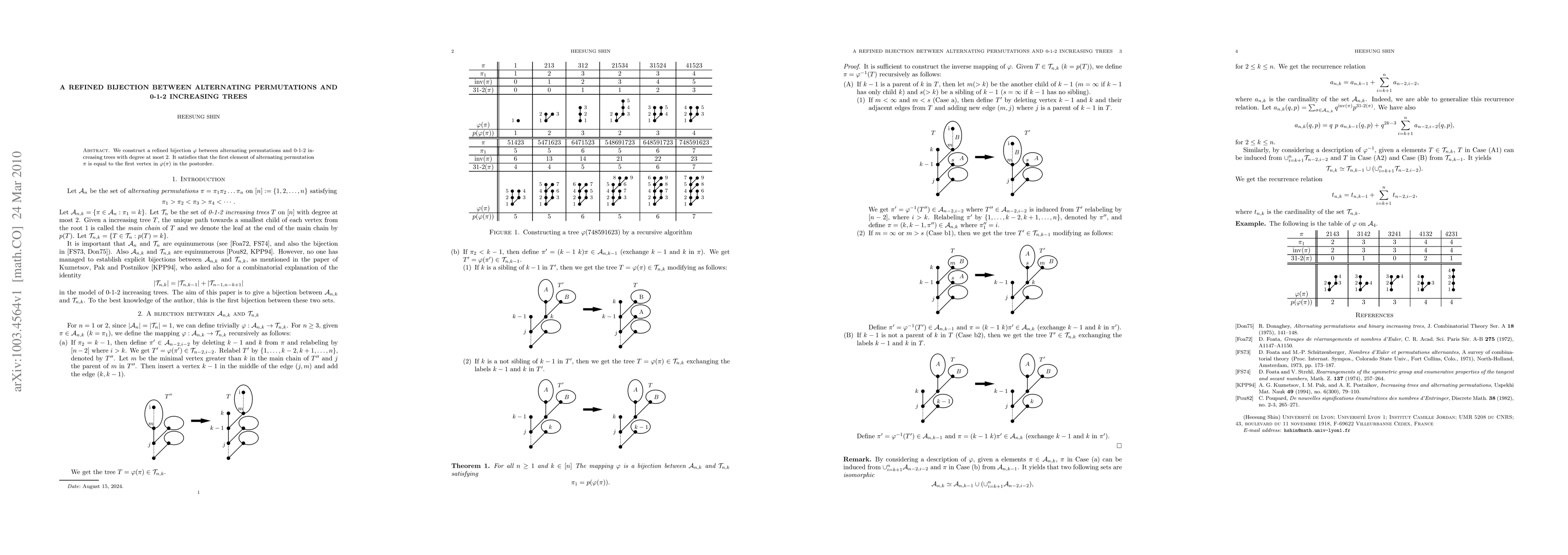 Summary: This paper establishes a refined bijection $\phi$ between alternating permutations and 0-1-2 increasing trees with degree at most 2, ensuring the first element of an alternating permutation corresponds to the first vertex in the postorder of the transformed tree.