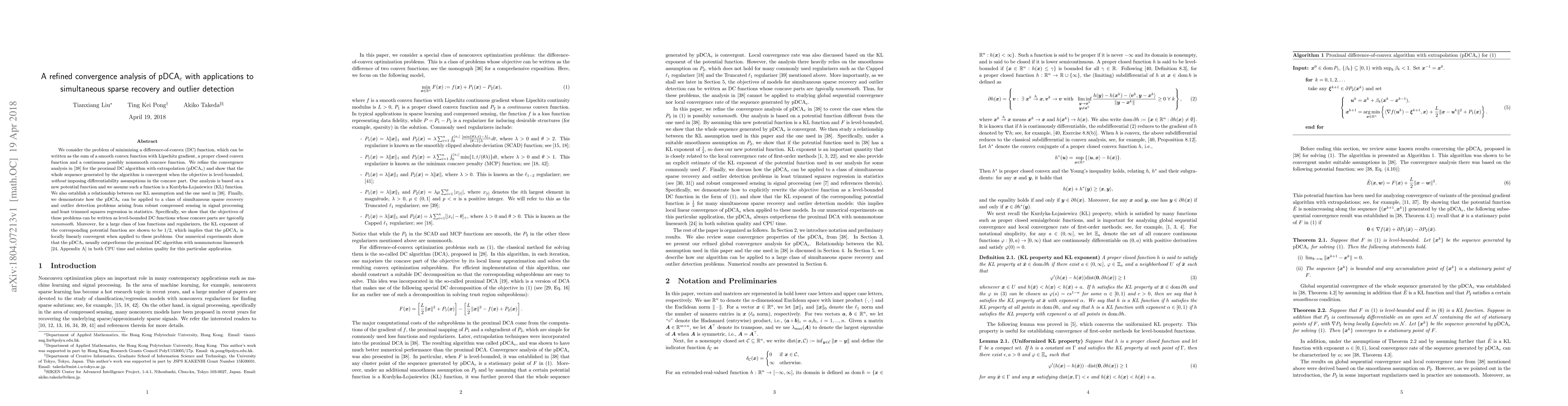 We consider the problem of minimizing a difference-of-convex (DC) function, which can be written as the sum of a smooth convex function with Lipschitz gradient, a proper closed convex function and a continuous possibly nonsmooth concave function. We refine the convergence analysis in [38] for the proximal DC algorithm with extrapolation (pDCA$_e$) and show that the whole sequence generated by the algorithm is convergent when the objective is level-bounded, {\em without} imposing differentiability assumptions in the concave part. Our analysis is based on a new potential function and we assume such a function is a Kurdyka-{\L}ojasiewicz (KL) function. We also establish a relationship between our KL assumption and the one used in [38]. Finally, we demonstrate how the pDCA$_e$ can be applied to a class of simultaneous sparse recovery and outlier detection problems arising from robust compressed sensing in signal processing and least trimmed squares regression in statistics. Specifically, we show that the objectives of these problems can be written as level-bounded DC functions whose concave parts are {\em typically nonsmooth}. Moreover, for a large class of loss functions and regularizers, the KL exponent of the corresponding potential function are shown to be 1/2, which implies that the pDCA$_e$ is locally linearly convergent when applied to these problems. Our numerical experiments show that the pDCA$_e$ usually outperforms the proximal DC algorithm with nonmonotone linesearch [24, Appendix A] in both CPU time and solution quality for this particular application.