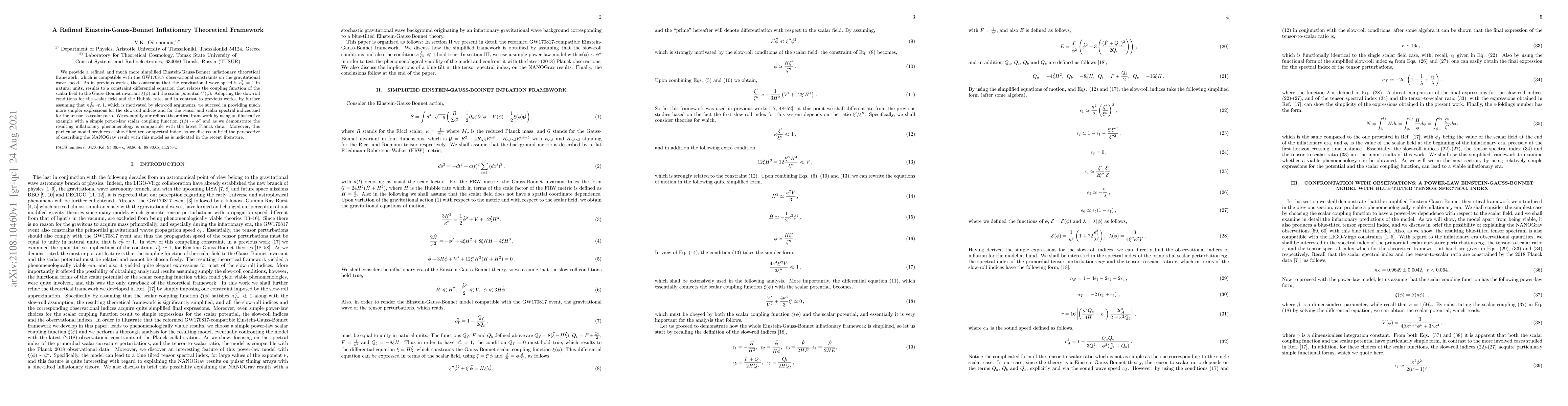 A refined Einstein-Gauss-Bonnet inflationary framework simplifies expressions for key indices, making it compatible with GW170817 constraints and the latest Planck data, while predicting a blue-tilted tensor spectral index.