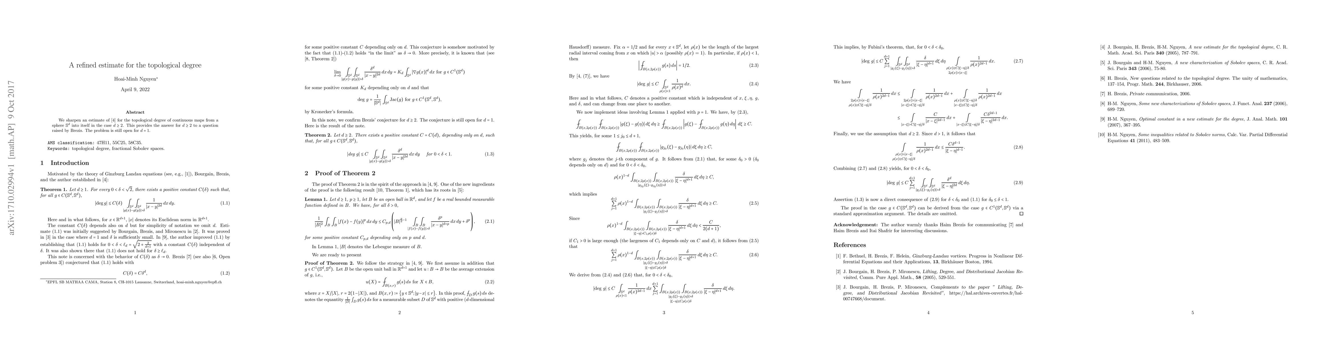 We sharpen an estimate of Bourgain, Brezis, and Nguyen for the topological degree of continuous maps from a sphere $\mathbb{S}^d$ into itself in the case $d \ge 2$. This provides the answer for $d \ge 2$ to a question raised by Brezis. The problem is still open for $d=1$.