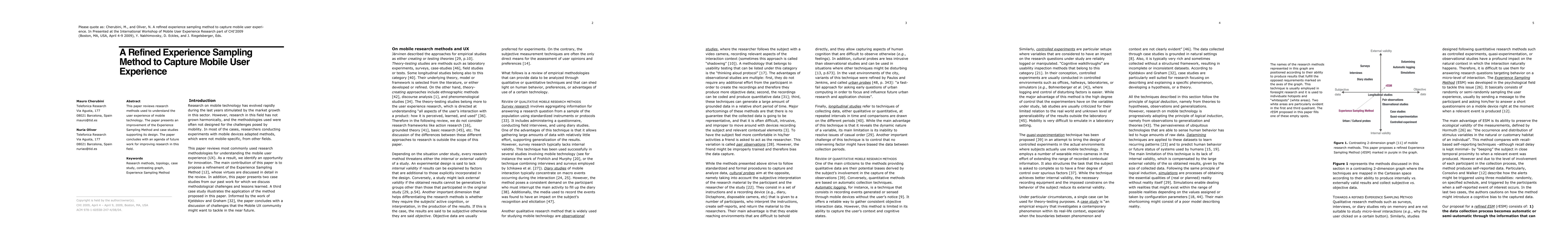 This paper reviews research methods used to understand the user experience of mobile technology. The paper presents an improvement of the Experience Sampling Method and case studies supporting its design. The paper concludes with an agenda of future work for improving research in this field. Keywords: Research methods, topology, case study, contrasting graph, Experience Sampling Method