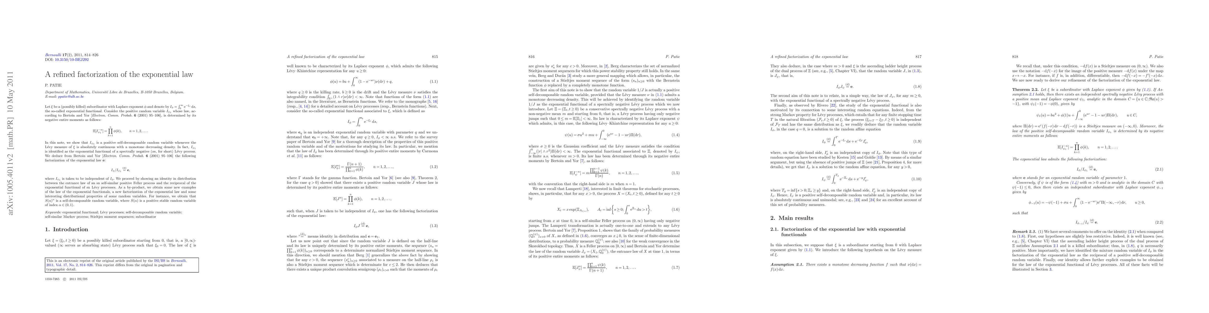 A new factorization of the exponential law is derived for positive random variables with a specific form of their Laplace exponent, linking it to spectrally negative Lévy processes and self-decomposable random variables.