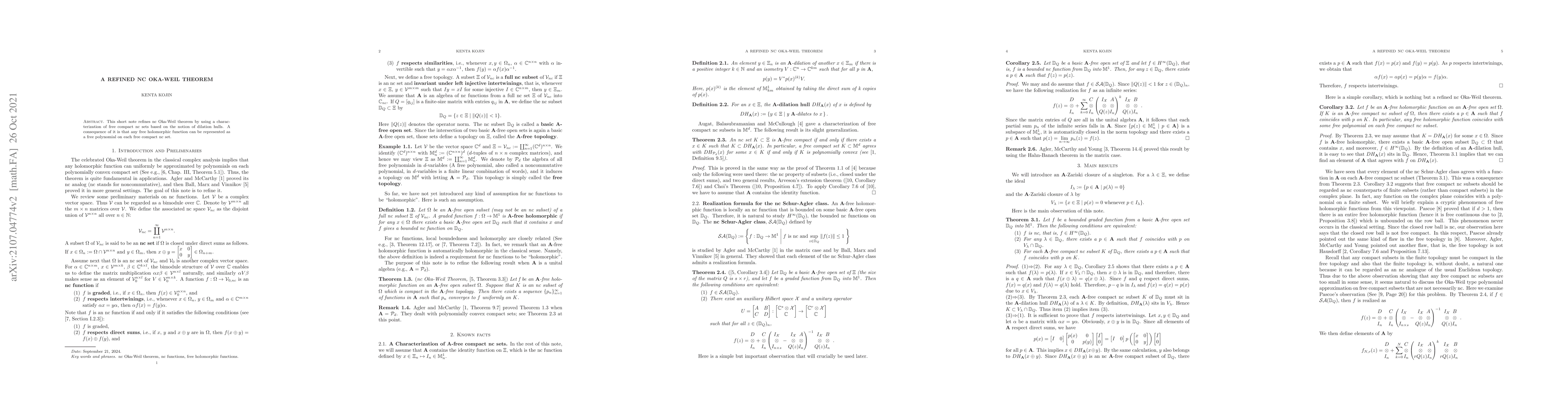 The research refines the noncommutative (nc) Oka-Weil theorem using a characterization of free compact nc sets based on dilation hulls.