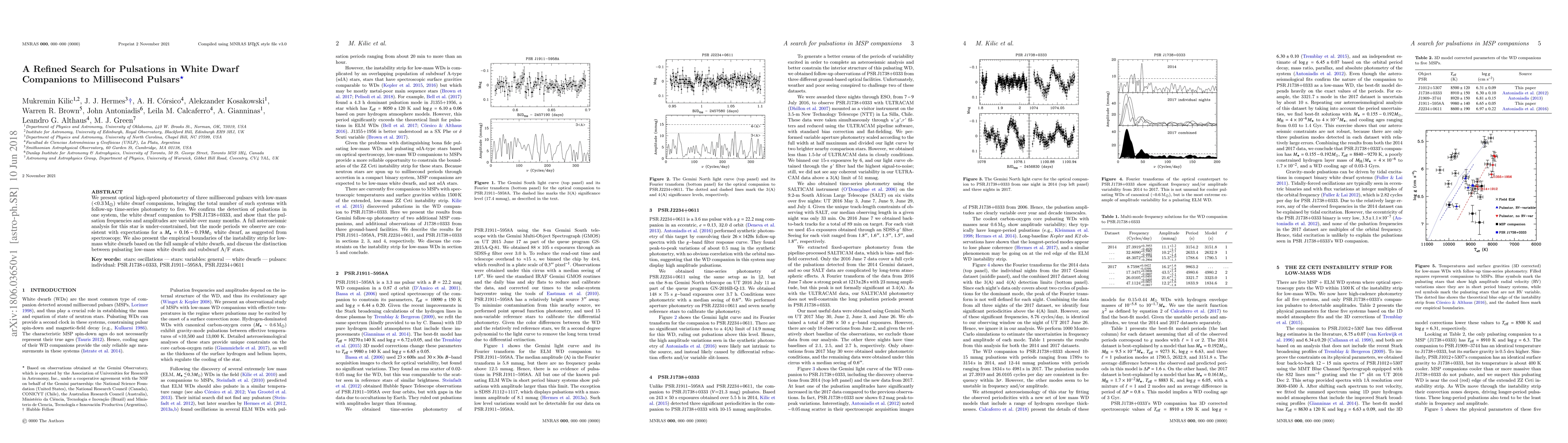 This study uses high-speed photometry to detect pulsations in white dwarf companions to millisecond pulsars, confirming variable pulsations in the white dwarf of PSR J1738+0333. The research also establishes empirical boundaries for the instability strip in low-mass white dwarfs and distinguishes them from subdwarf A/F stars.