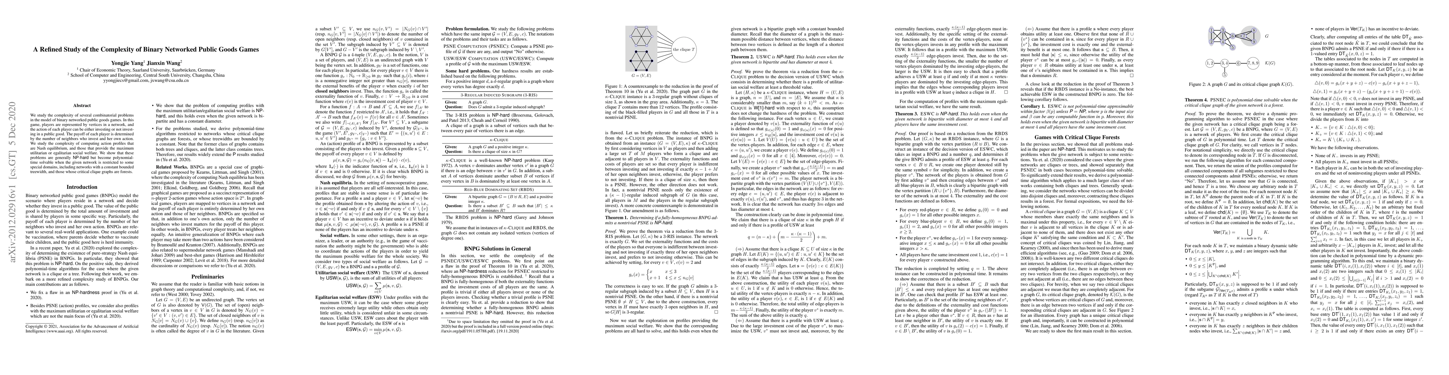 This paper investigates the computational complexity of binary networked public goods games, demonstrating that finding Nash equilibria and maximizing social welfare are NP-hard but can be solved in polynomial time for networks with specific structural constraints like bounded treewidth or forest-like critical clique graphs.